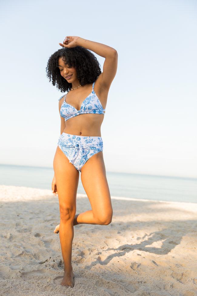 Details Blue and Ivory Vintage Floral Print Bikini Bottom Fabric has stretch Adjustable back tie Lined Size small from waist to hem: 11" Material and Care Body: 82% polyester 18% elastane, lining: 95% polyester 5% elastane Machine wash cold, line dry Patterns may vary Materials may have natural variations Colors may vary from different viewing devices.