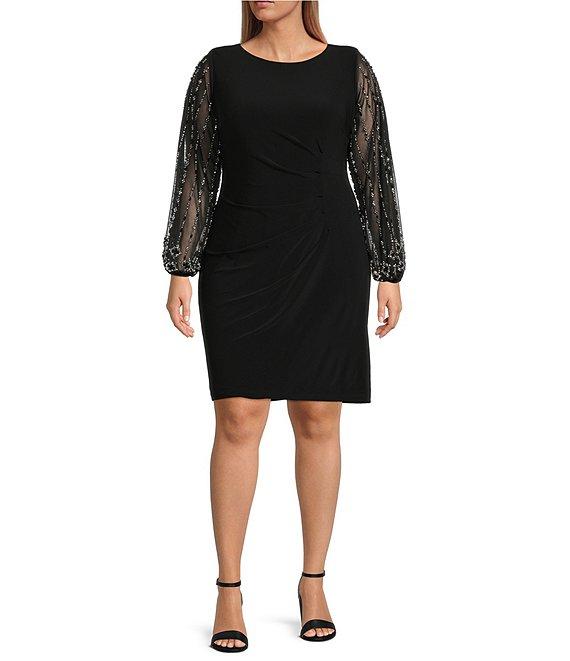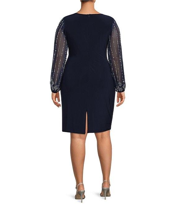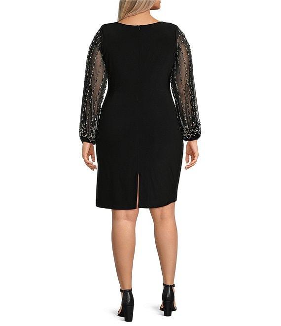 Marina Plus Size Long Beaded Sleeves Round Neck Jersey Sheath Dress