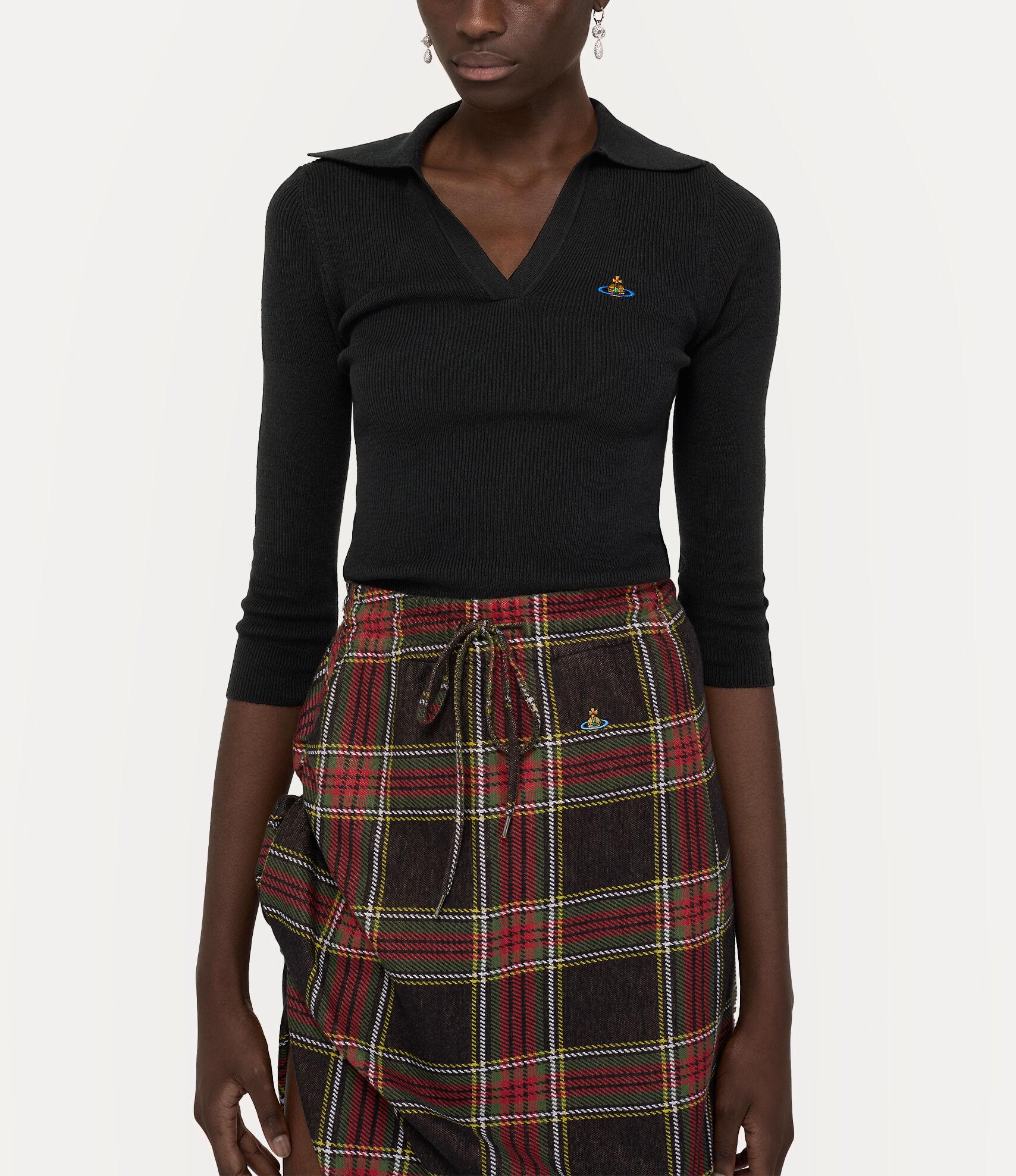 Our Marina polo sweater features a fitted silhouette, complete with a polo-inspired collar and three-quarter length sleeves. The piece offers an all-over ribbed finish, accented with the house's signature orb embroidery, which symbolises tradition, encircled by the celestial rings of Saturn, symbolising the future.
