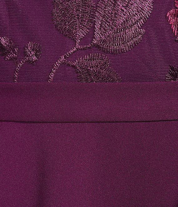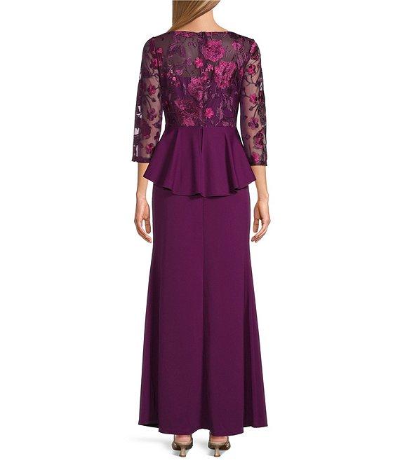 From Marina, this dress features: Scuba crepe fabrication Crew neckline 3/4 sleeves Flower embroidered top Peplum silhouette Lined Center back zipper closure Hook and eye closure Approx. 57" in length Polyester/spandex Hand wash cold/lay flat to dry Made in the USA.