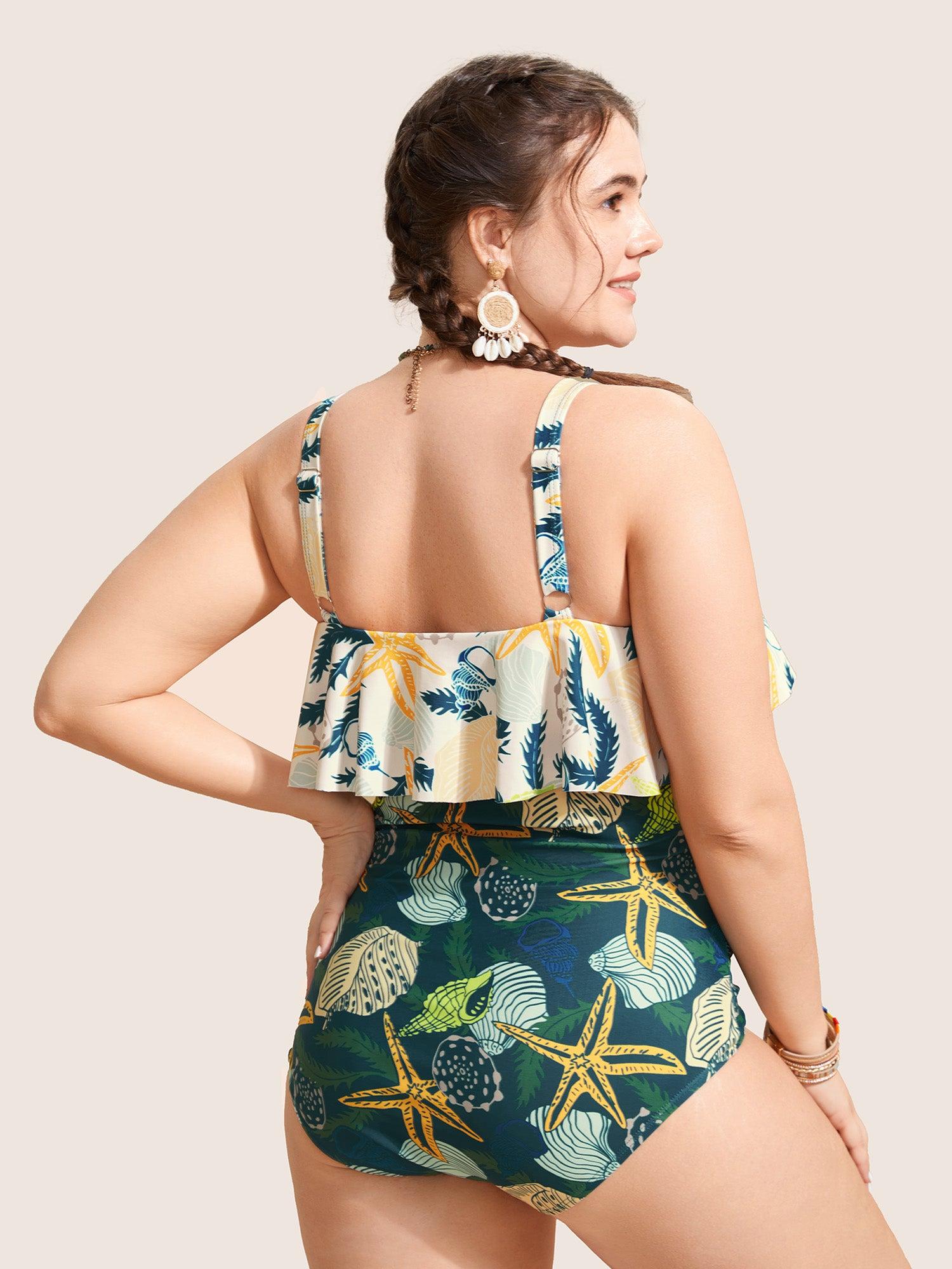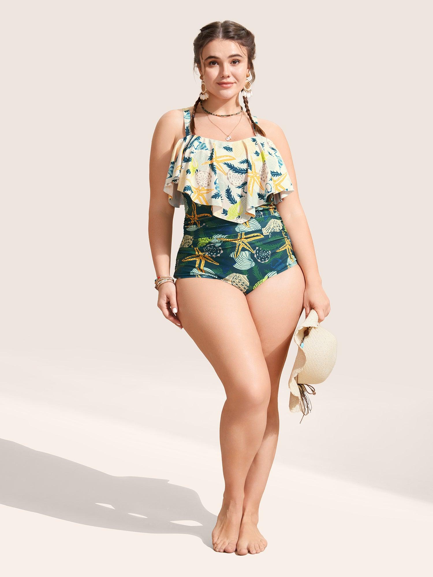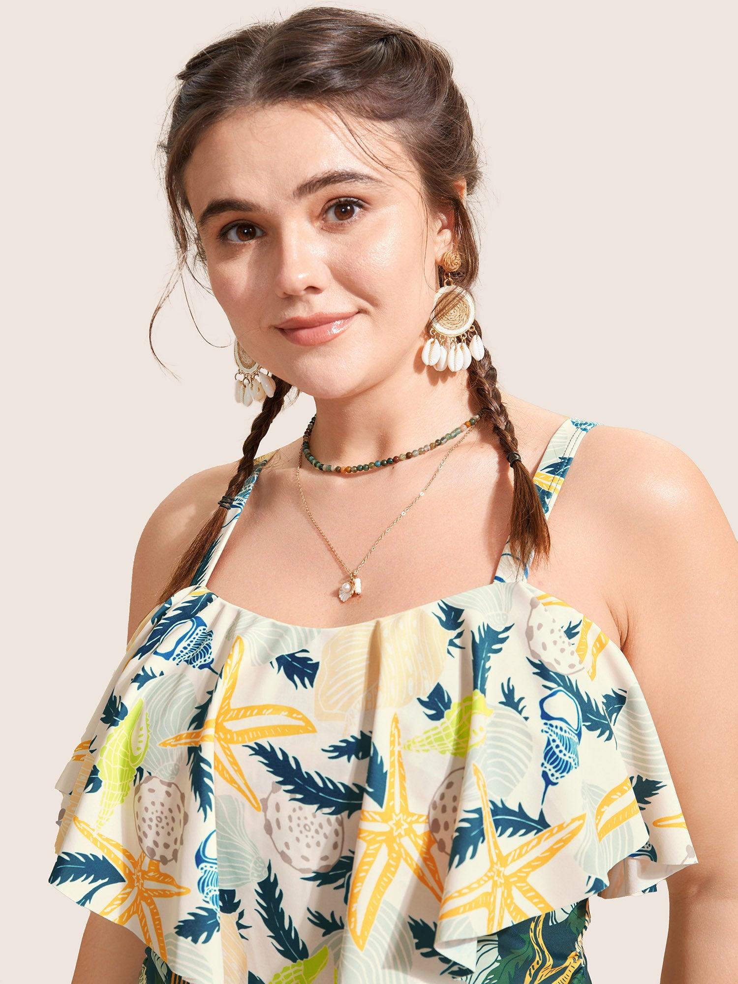 Shop Marine Elements Tiered Ruffles One Piece Swimsuit now and redefine your style with confidence at BloomChic. Tailored for mid and plus-size women. This trendy Swimwear Women, sizes 10-30. Season:Summer;Color:Beige;Style:Beach;Cup Type:Removable cups;Neckline:U-neck;Sleeve Type:Sleeveless;Prints:Marine Elements;Details:Ruffles, Gathered, Contrast, Tiered;Pocket:No-pocket;Belt:No-belt;Chest pad:Removable Padding;Lining:Lining;Closure Type:Non
