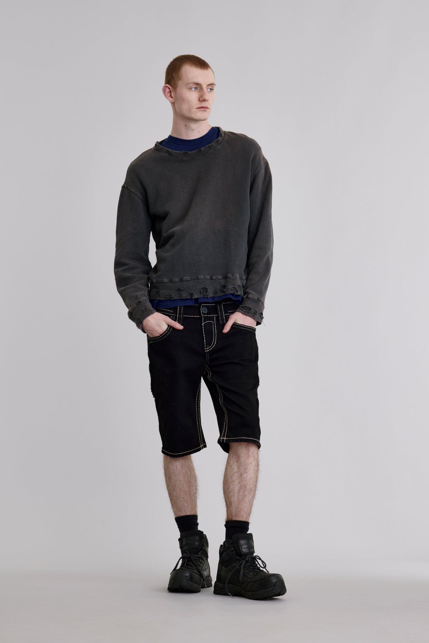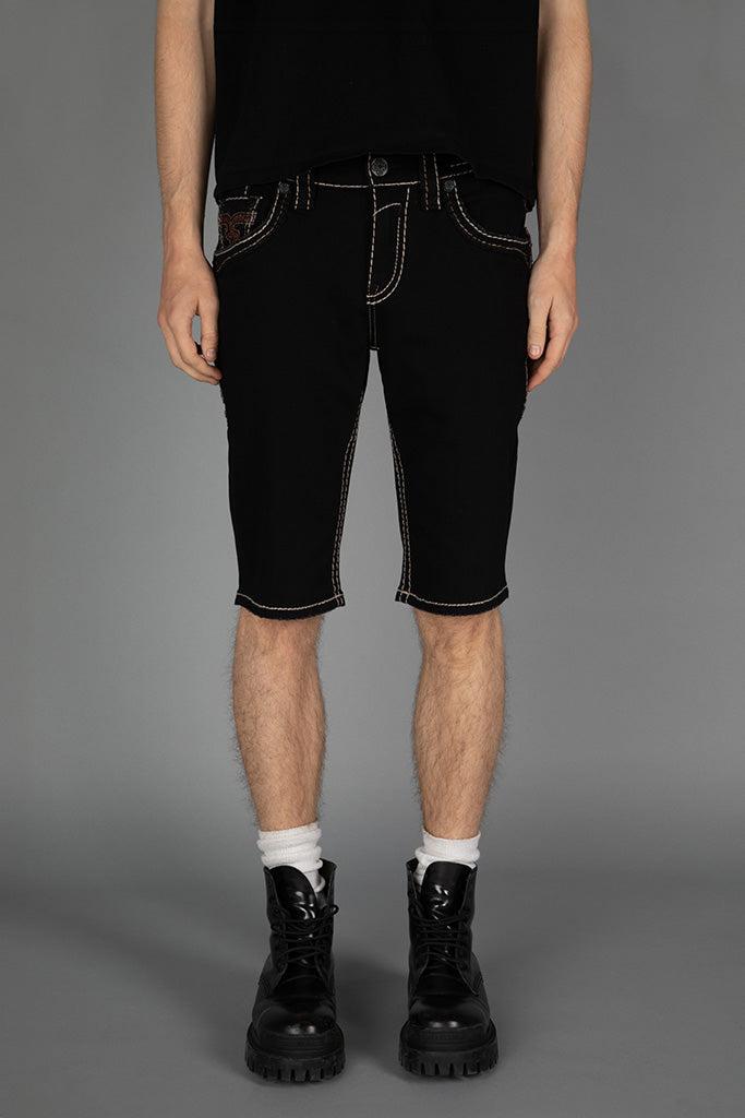 Custom matte black buttons and rivets hardware decoration throughout. Signature sizing arrow on fabric decorated with “ROCK’’ pattern with red and black stitching on both sides. Front legs feature a double coin pocket with an inverted Fleur De Lis logo, one wash, grinding, and hem grinding. Blowout back pockets featuring the iconic inverted Fleur De Lis logo. “ROCK” pattern, filled with red and black stitching and black leather. "Rock Revival" pewter metal engraved on red and white stitch on a black snake print patch on the belt loop. Designed with care and creativity in Los Angeles, California.