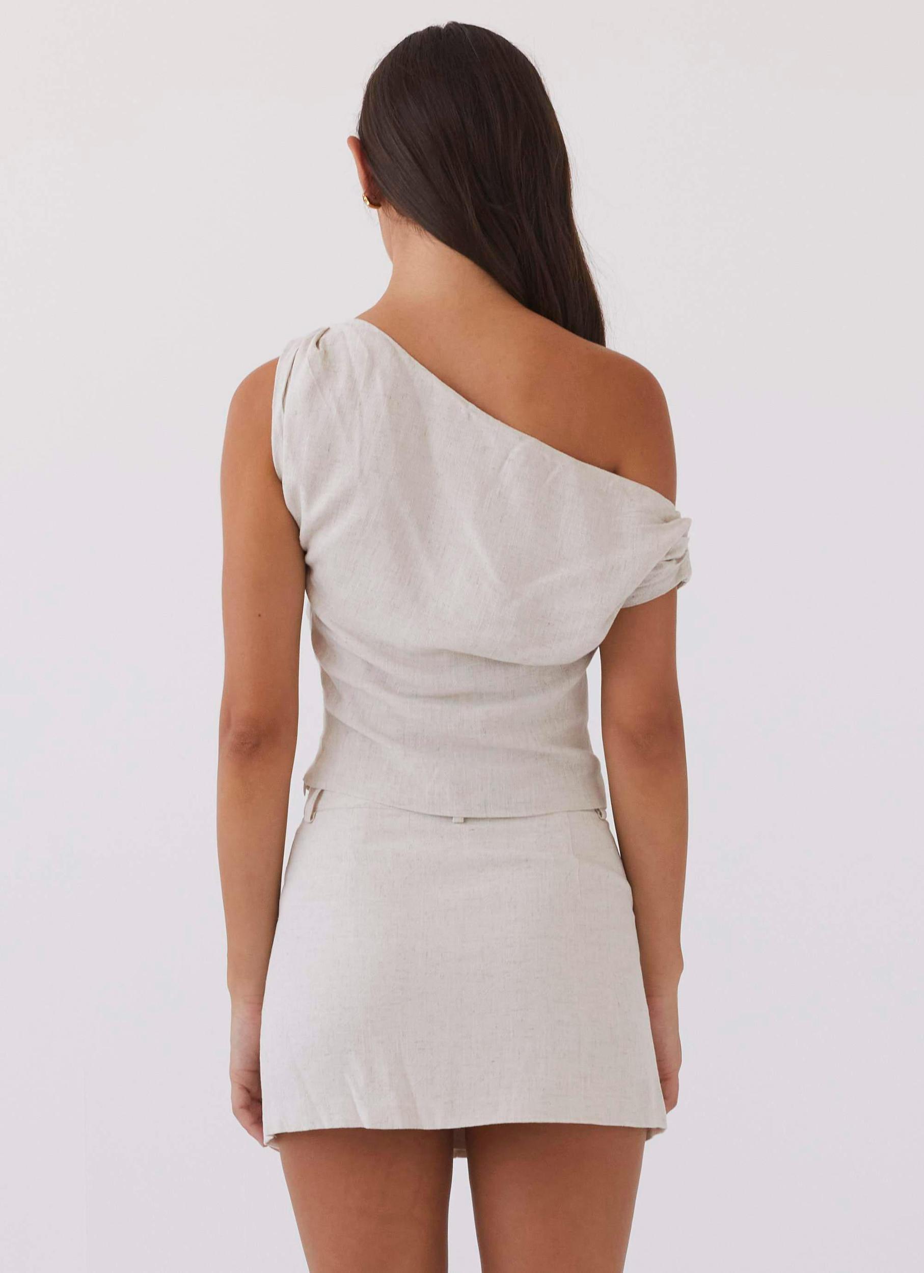 Peppermayo Exclusive The Marissa Linen Mini Skirt is made from a high quality linen and cotton blend. Featuring a natural and neutral look with twin hip pockets and mid rise fit. Pair with Marissa Linen One Shoulder Top. - Mini skirt- Fly front zipper with hook and bar closure- Twin hip pockets- Lined- Belt hoops- 45% Linen, 55% Cotton Size AU 8 garment measurements:Waist 72cmLength 34cmHip 94cm Roberta wears size US 2 (X-Small or AU 6 equivalent)