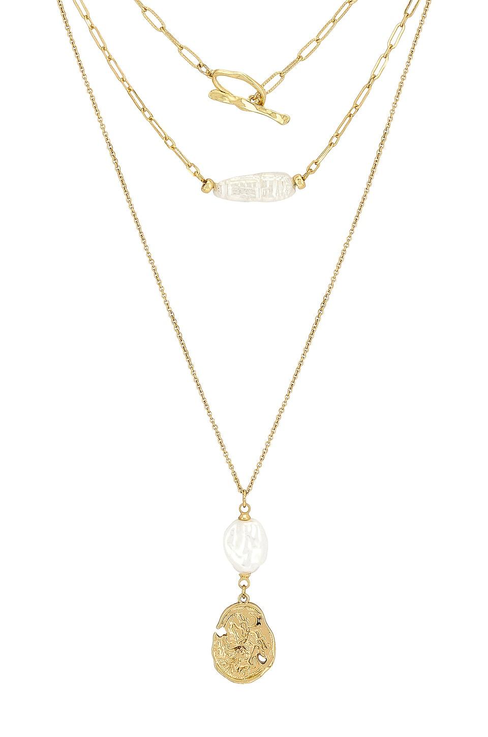 Gold plated with freshwater pearl and hammered metal charms. Made in China. Lobster clasp and toggle clasp closure. Layered set. Measures approx 14" - 18" in length with a 3" extender. Revolve Style No. 8OTH-WL1243. Manufacturer Style No. 8ORREV0106.