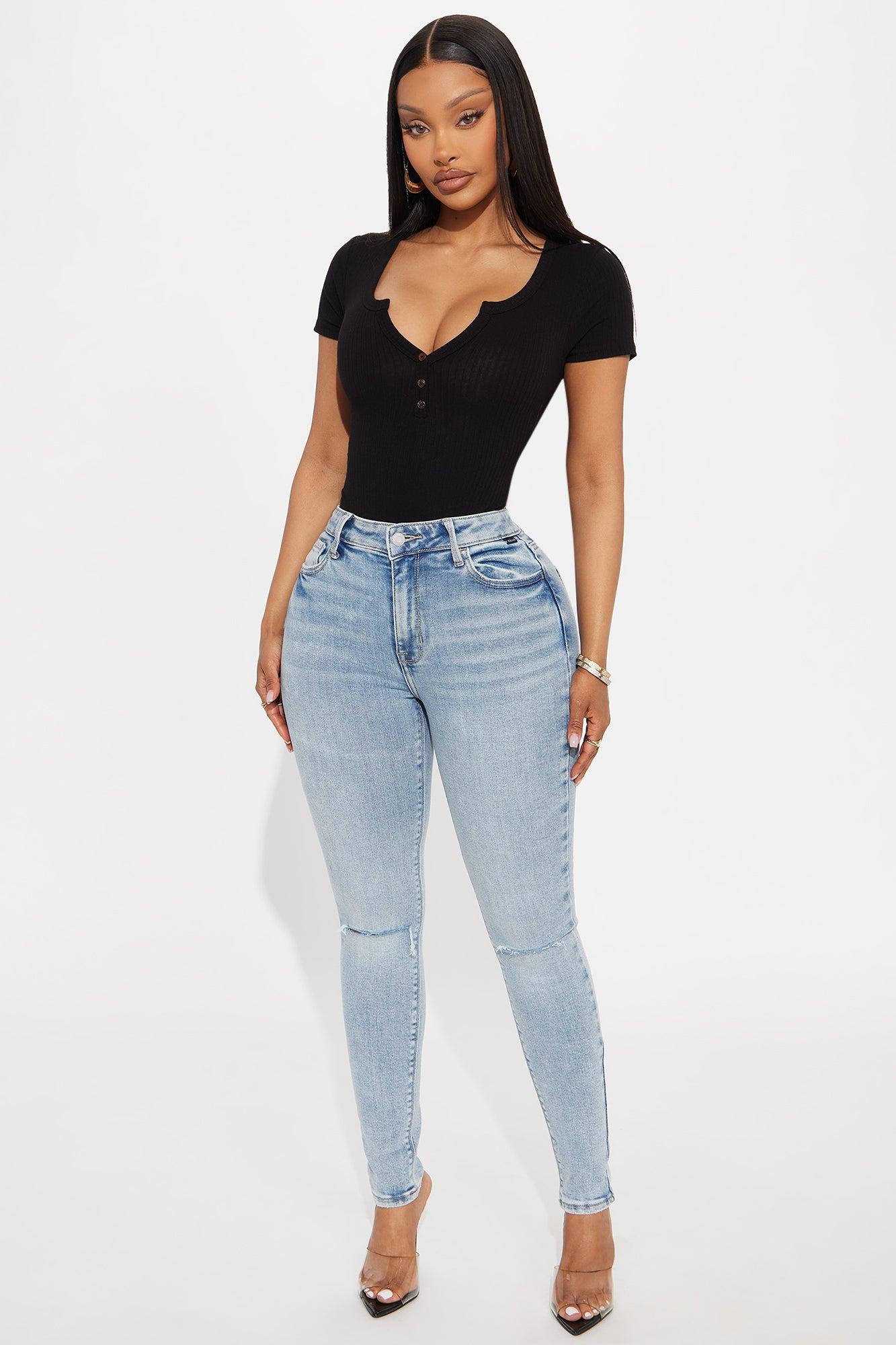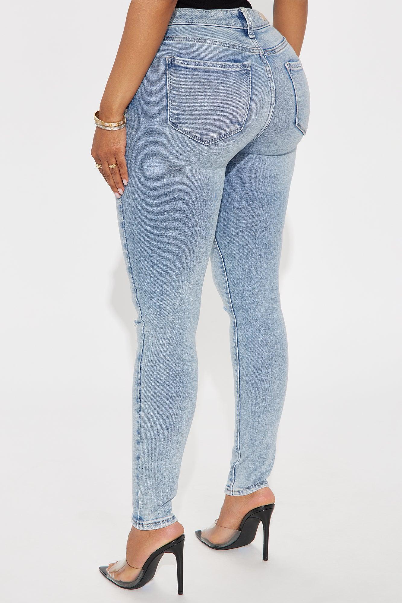 Available In Light Wash. Skinny Jean 5 Pocket Knee Slits 10.5" High Rise 28" Inseam Medium Stretch Disclaimer: Due To The Specialized Wash, Each Garment Is Unique. 93% Cotton 5% Polyester 2% Spandex Imported