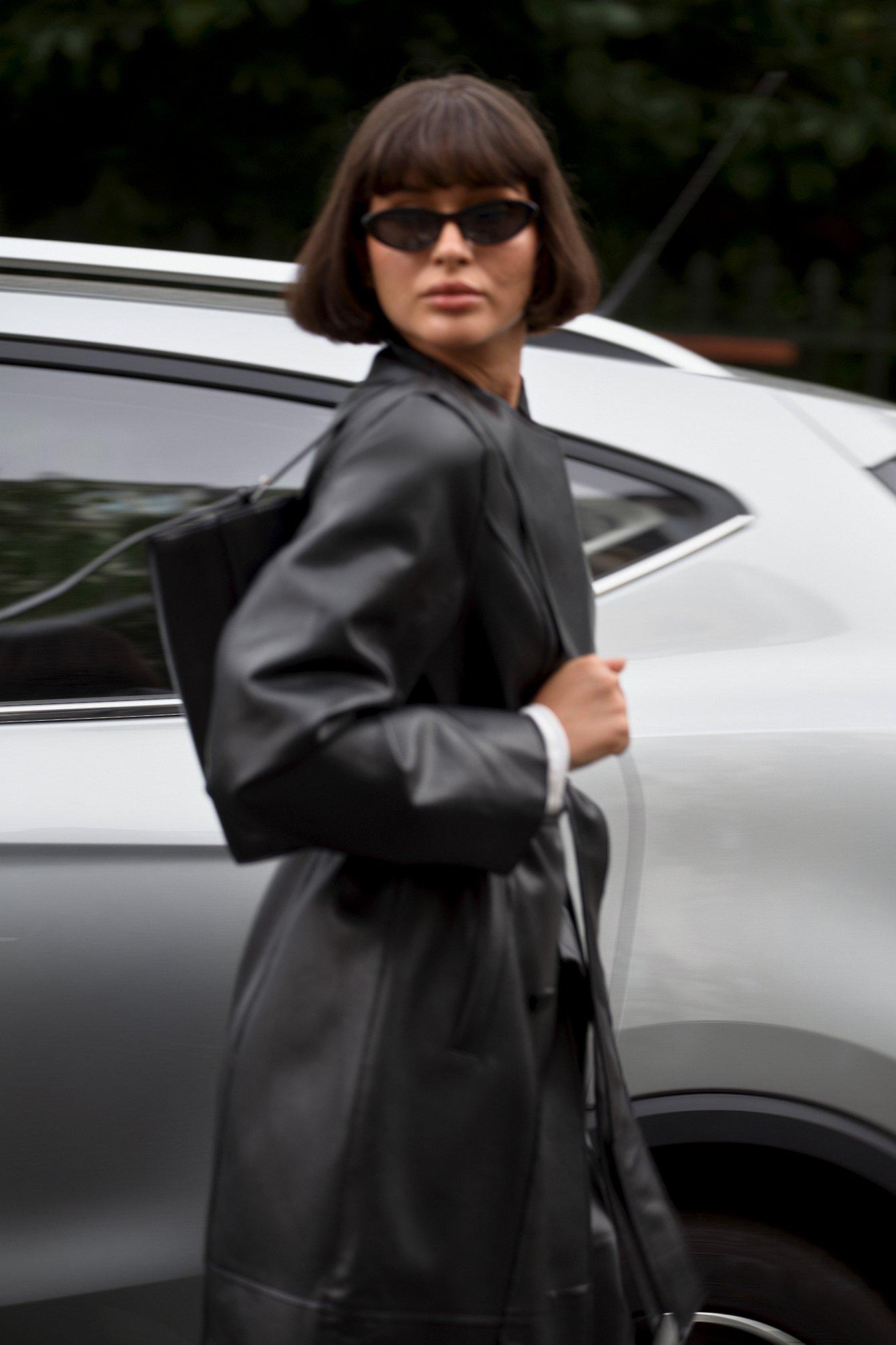 This jacket features a faux leather and a marked waist. It has a double-breasted button design with a self-tie belt.