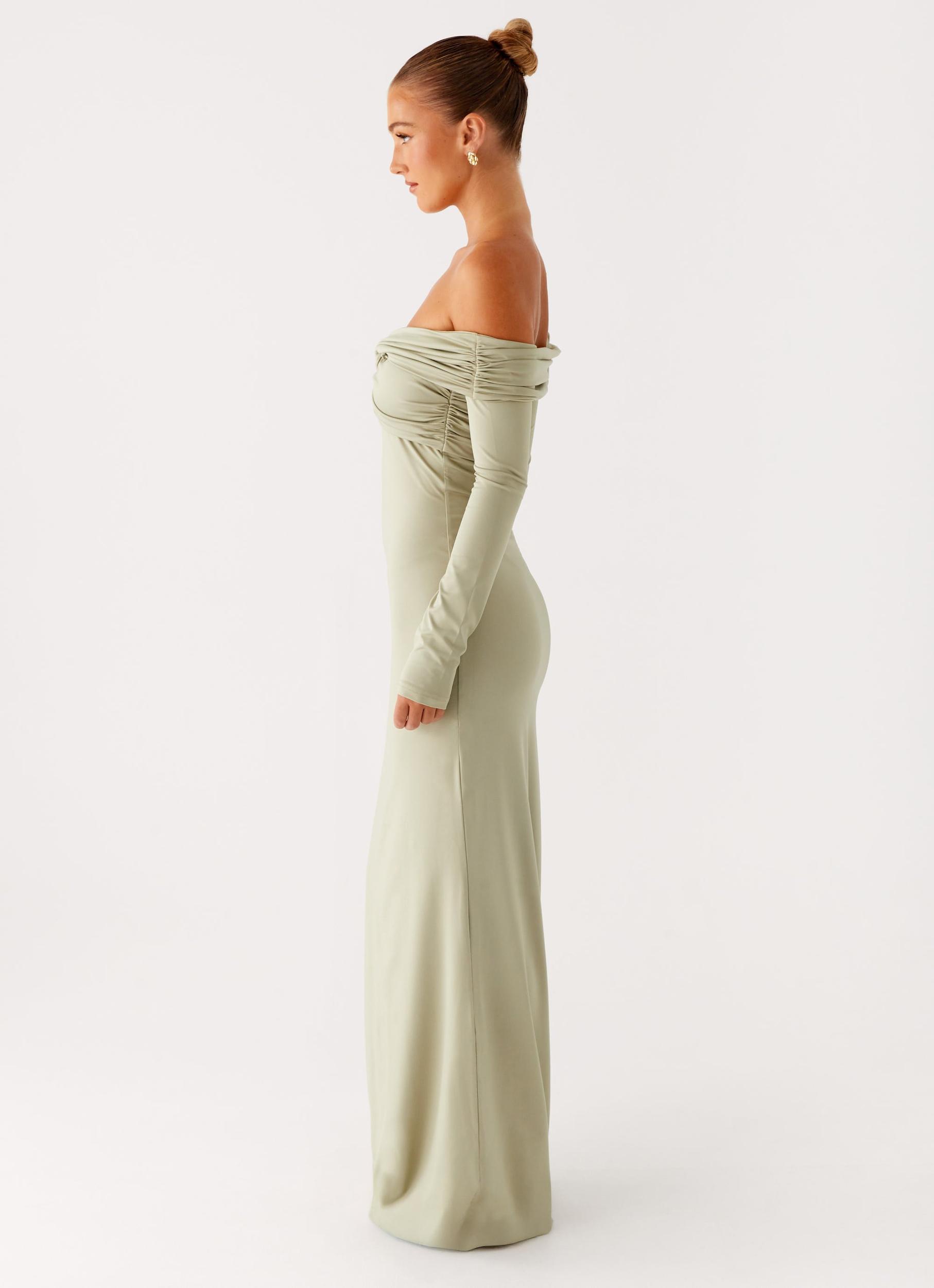Peppermayo Exclusive The Marla Long Sleeve Maxi Dress is an effortless blend of sophistication and allure. With its off-shoulder neckline, this dress reveals just the right amount of skin while maintaining elegance. The long sleeves add a touch of refinement, while the fully lined design ensures comfort and a flawless fit. - Maxi length- Off-shoulder neckline- Twisted bustier detailing- Fully lined- Stretch jersey material- Open back- Silicone neckline taping- Fabric: 95% Polyester, 5% Spandex Size AU 8 / US 4 garment measurements: Length - 136 cm / 53.5 inBust - 72 cm / 28.3 inWaist - 64 cm / 25.2 inHip - 84 cm / 33.1 inHem - 120 cm / 47.2 inSleeve Length - 54 cm / 21.3 in Yasmin is 170cm and wearing a size AU 8 / and US 4