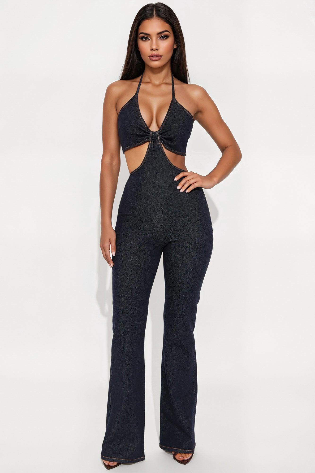 Available In Indigo. Jumpsuit Back Neck Tie Detail Back Zip Closure Flare Leg Inseam = 34" Stretch Self:93%Cotton 6%Polyester 1%Spandex Imported California Proposition 65WARNING: Cancer and Reproductive Harm - www.P65Warnings.ca.gov.