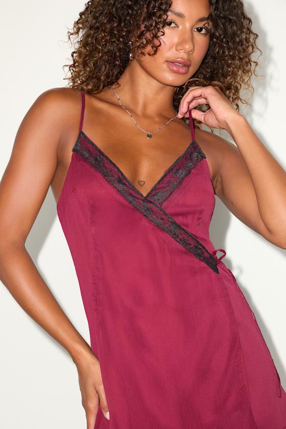We hope you've been practicing your strut, because that's all you'll want to do in this airy chiffon mini dress. The slip-style silhouette boasts a wrap design, featuring a lace-trimmed surplice neckline and slender ties that secure at the side. A flirty ruffled hem and adjustable straps complete the look.