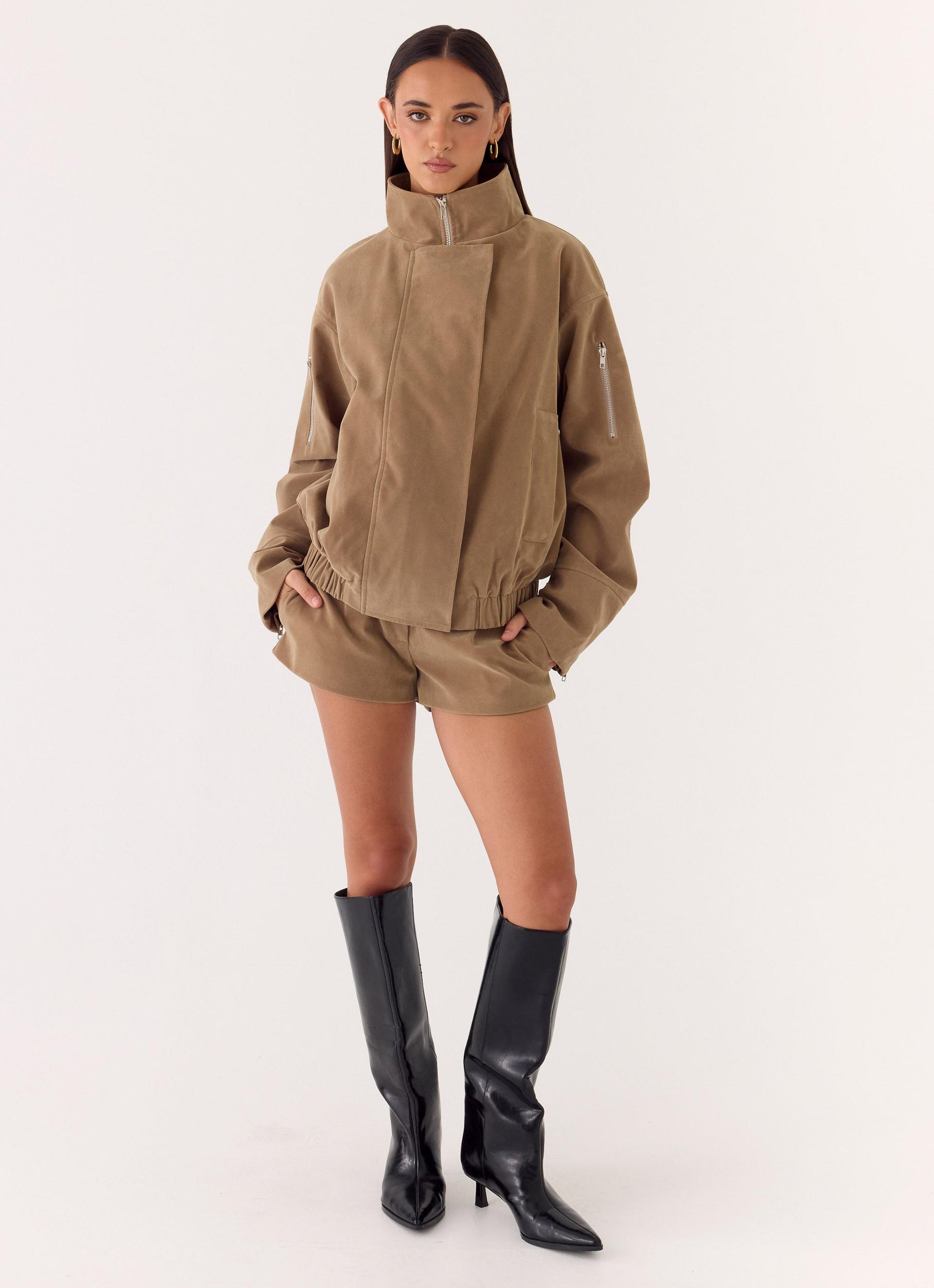 Peppermayo Exclusive The Marlow Faux Suede Jacket is made for bold, statement layering. Featuring a high funnel neck and oversized silhouette, this fully lined jacket is crafted in soft faux suede for both style and comfort. With functional details like a hidden front zipper under a snap placket, side welt pockets, and sleeve zippers, it’s perfect for elevating casual and evening outfits alike. - High funnel neck- Front metal zipper (hidden under snap placket)- Faux suede- Fully lined- Side welt pockets- Oversized fit- Elasticated hem- Long sleeves with functional sleeve zippers- Back vent pleat- Fabric: 50% PU, 50% Polyester Size AU 8 / US 4 garment measurements:Length: 64 cm / 25.20 inChest: 122 cm / 48.03 inHem: 98 cm / 38.58 inSleeve length: 62 cm / 24.41 in Roberta is 177cm and wears size AU 6 / size US 2