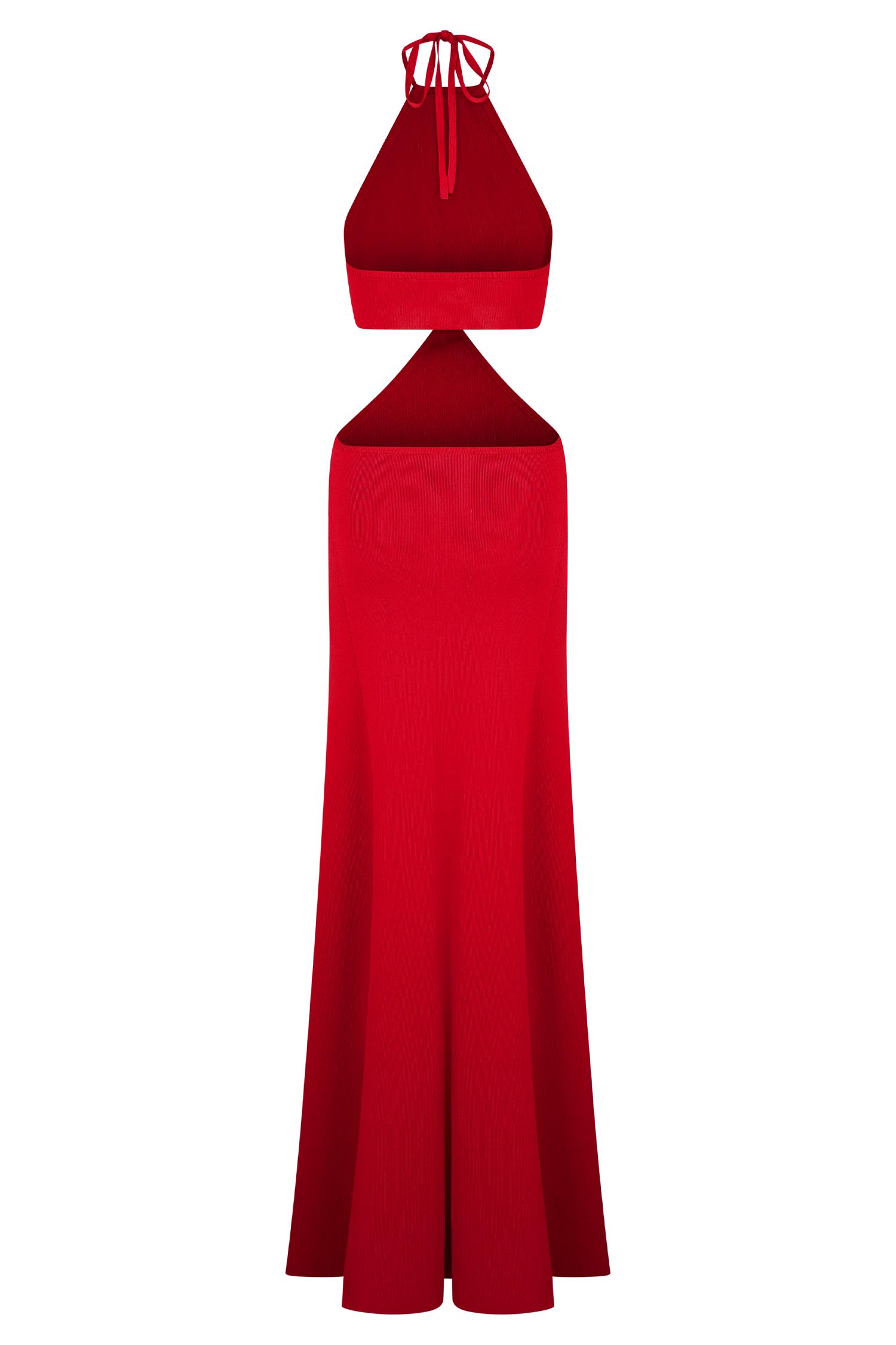 Bold back, soft stretch. The MARLOWE Halter Knit Maxi Dress is a statement in effortless sensuality. Featuring an adjustable halter neckline and a striking open back, this dress is designed to turn heads with a front hardware detail and side-to-back waist cutout that flatters and defines. The A-line skirt adds balance to the bold silhouette, while the unlined knit keeps it lightweight and breathable. Perfect for warm evenings, holiday getaways, or anytime you want your outfit to do the talking.