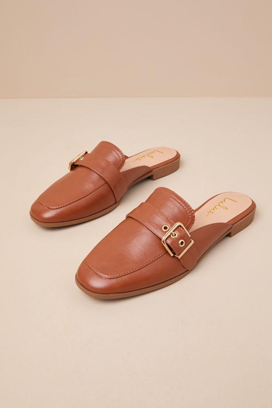 Upgrade your everyday flats with a chic new option like the Lulus Marquete Chestnut Buckle Mule Slides! These too-cute mules have a smooth, faux leather construction that shapes an almond toe upper and an adjustable strap with a gold buckle and matching grommets. Classic notched collar leads to a slide-on design for effortless styling.