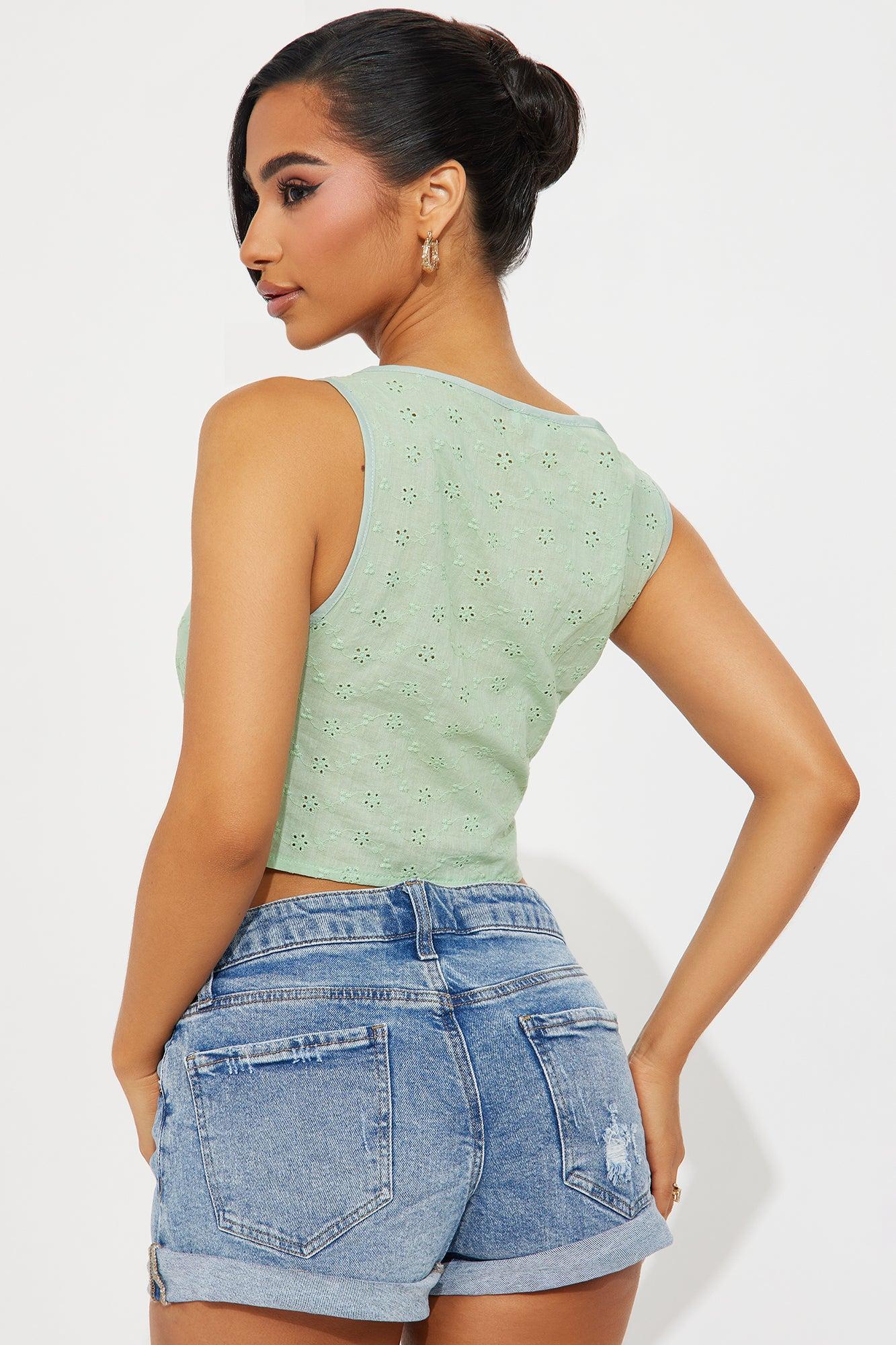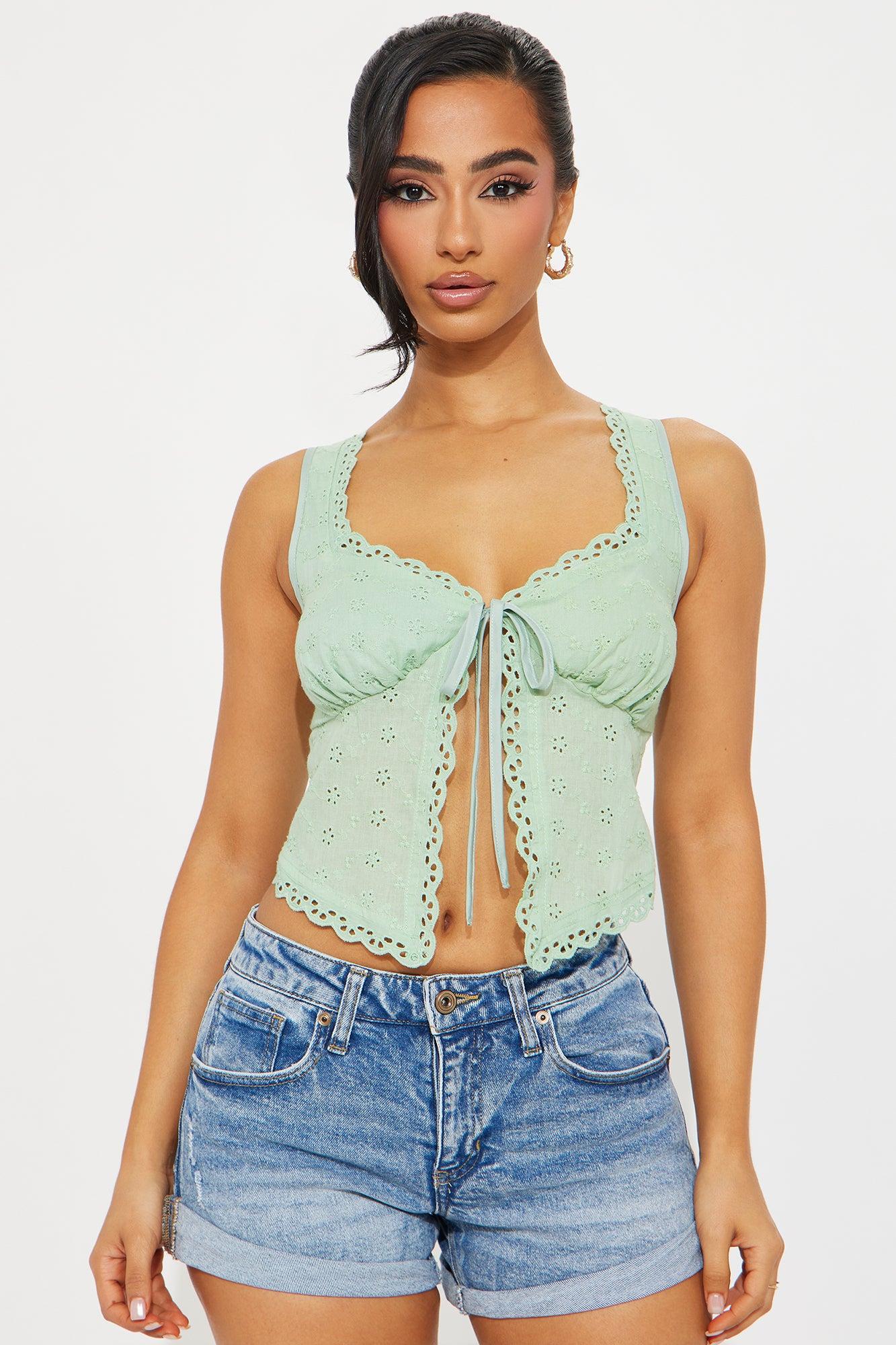 Available In White And Sage. Eyelet Top Non Stretch Tie Front Partial Lining 100% Cotton Imported