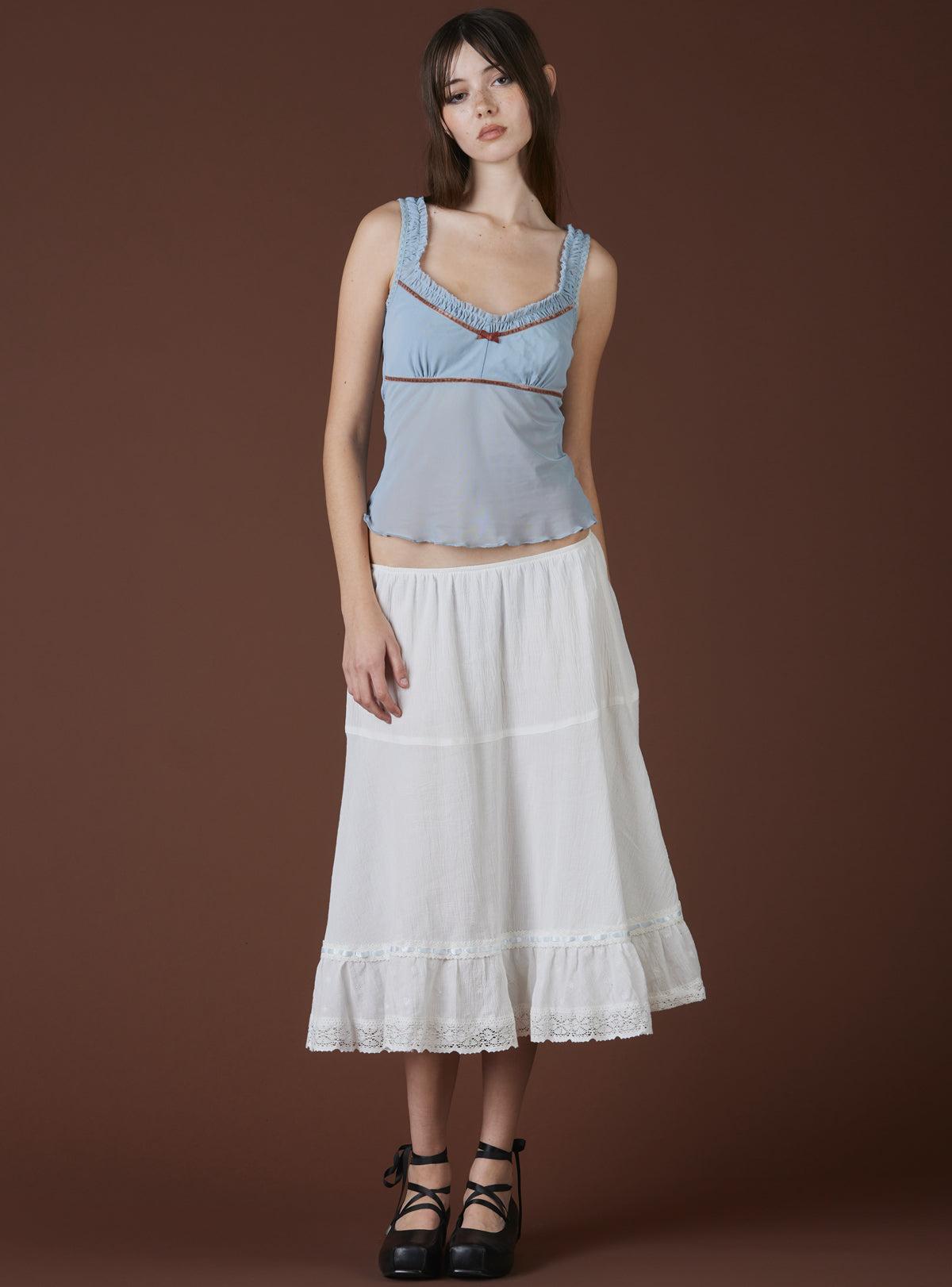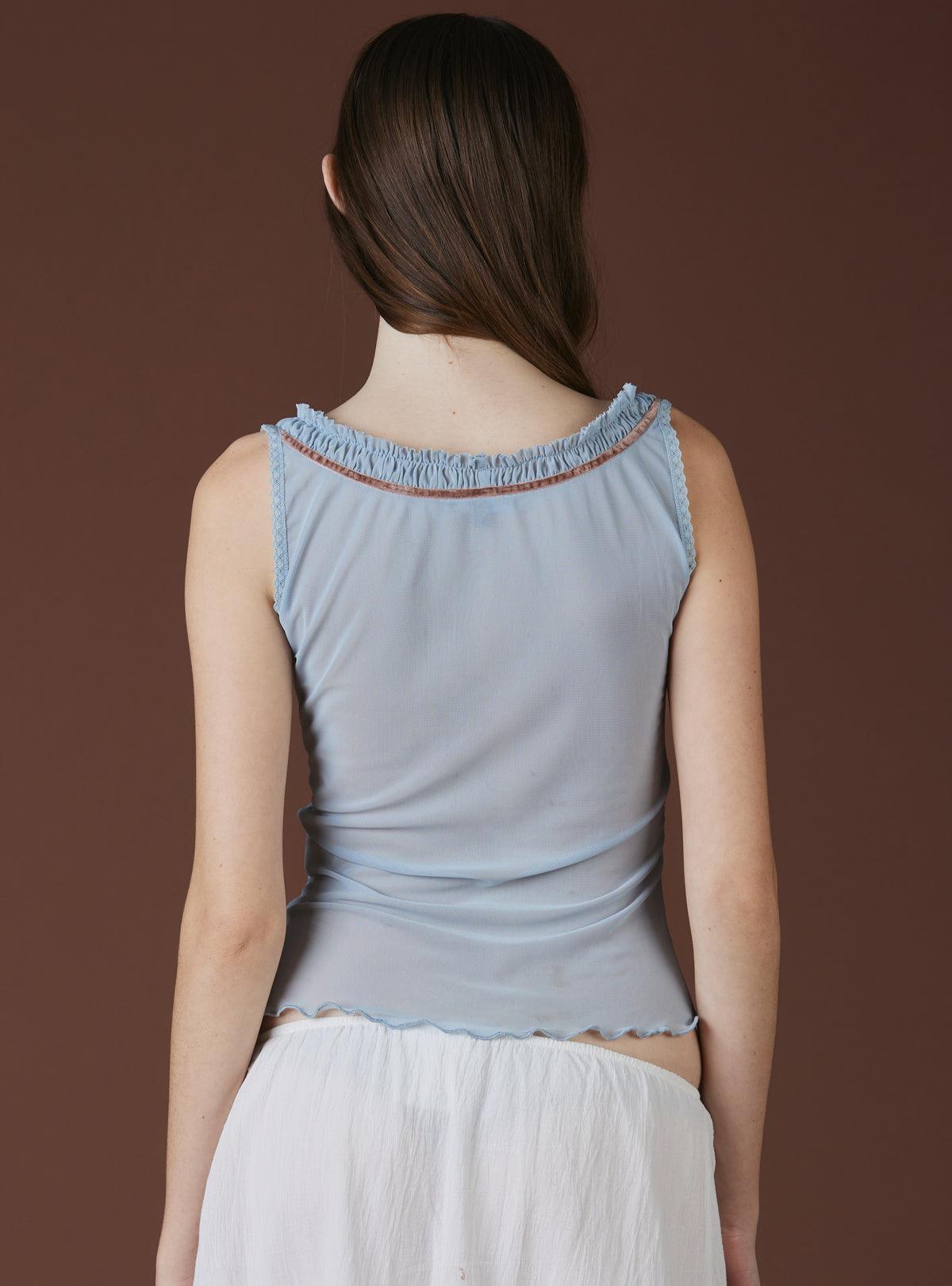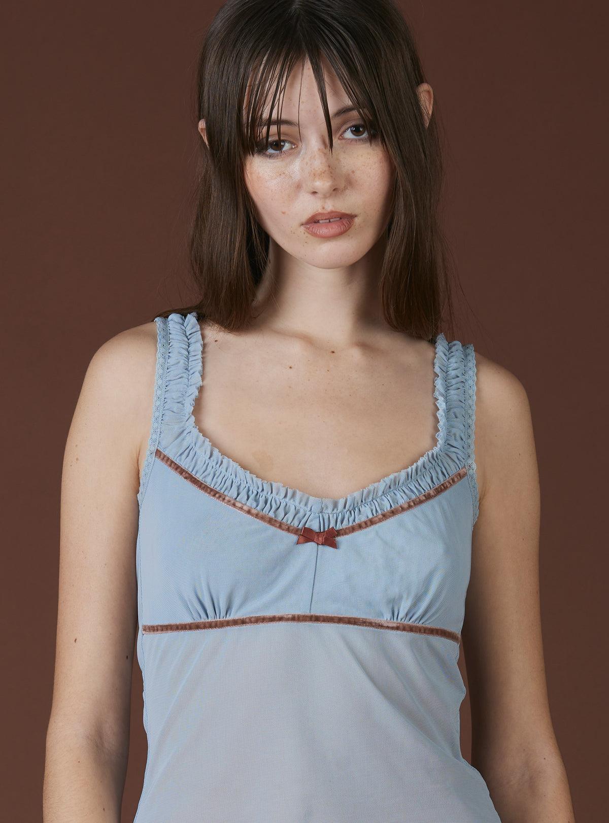 Drift into a dreamscape with this ethereal mesh top; a delicate fairycore empire waist adorned with plush velvet detailing that adds a whisper of vintage romance. Layer it over a lacy bralette for a **coquette-inspired** look, or pair it with the bobbins skirt for a cottagecore fantasy. Available in multiple colorways. Model is 5'8" and wearing a size S. 98% Polyester, 2% SpandexImported SKU: UWT-1505
