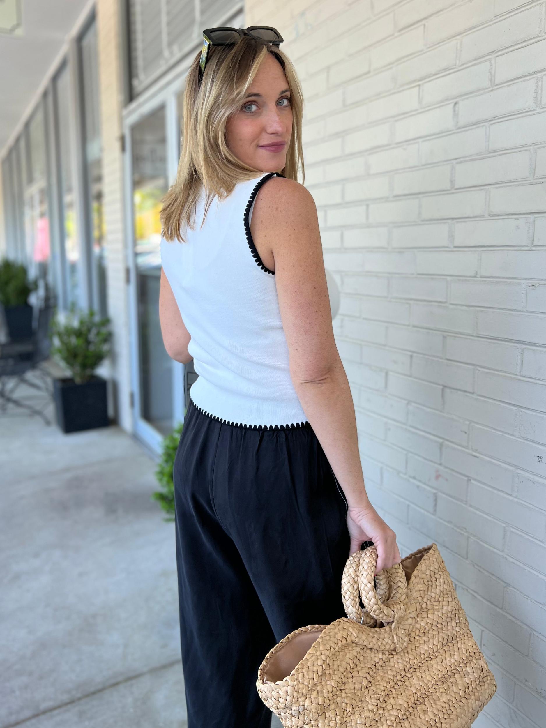 Get ready to add some playfulness to your wardrobe with the Martha Knit Top! This white scoop neck tank top features black contrasting trim for a touch of quirkiness. Perfect for any occasion, this sleeveless knit will bring a fun and unique touch to your outfits.