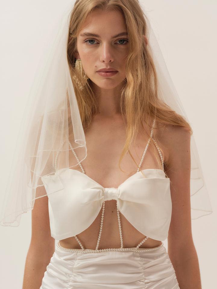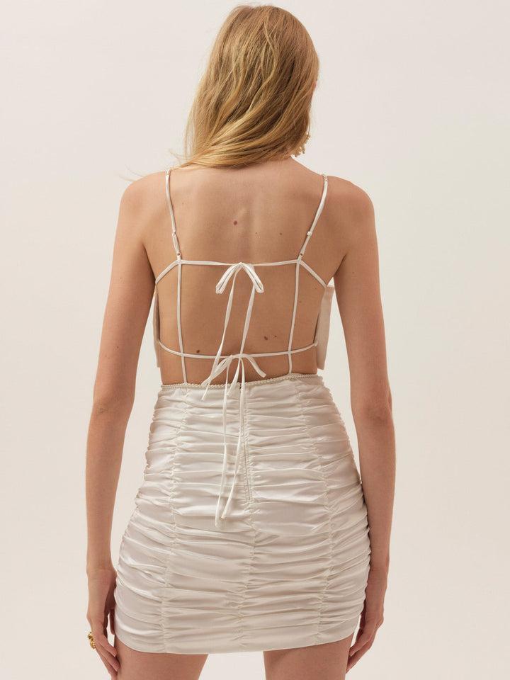 The Martina white satin mini dress is made for celebrating, crafted with crystal trim detailing and finished with a satin bust bow. Designed to let the bride shine, it’s the perfect engagement party dress or bachelorette party dress for unforgettable bridal moments.