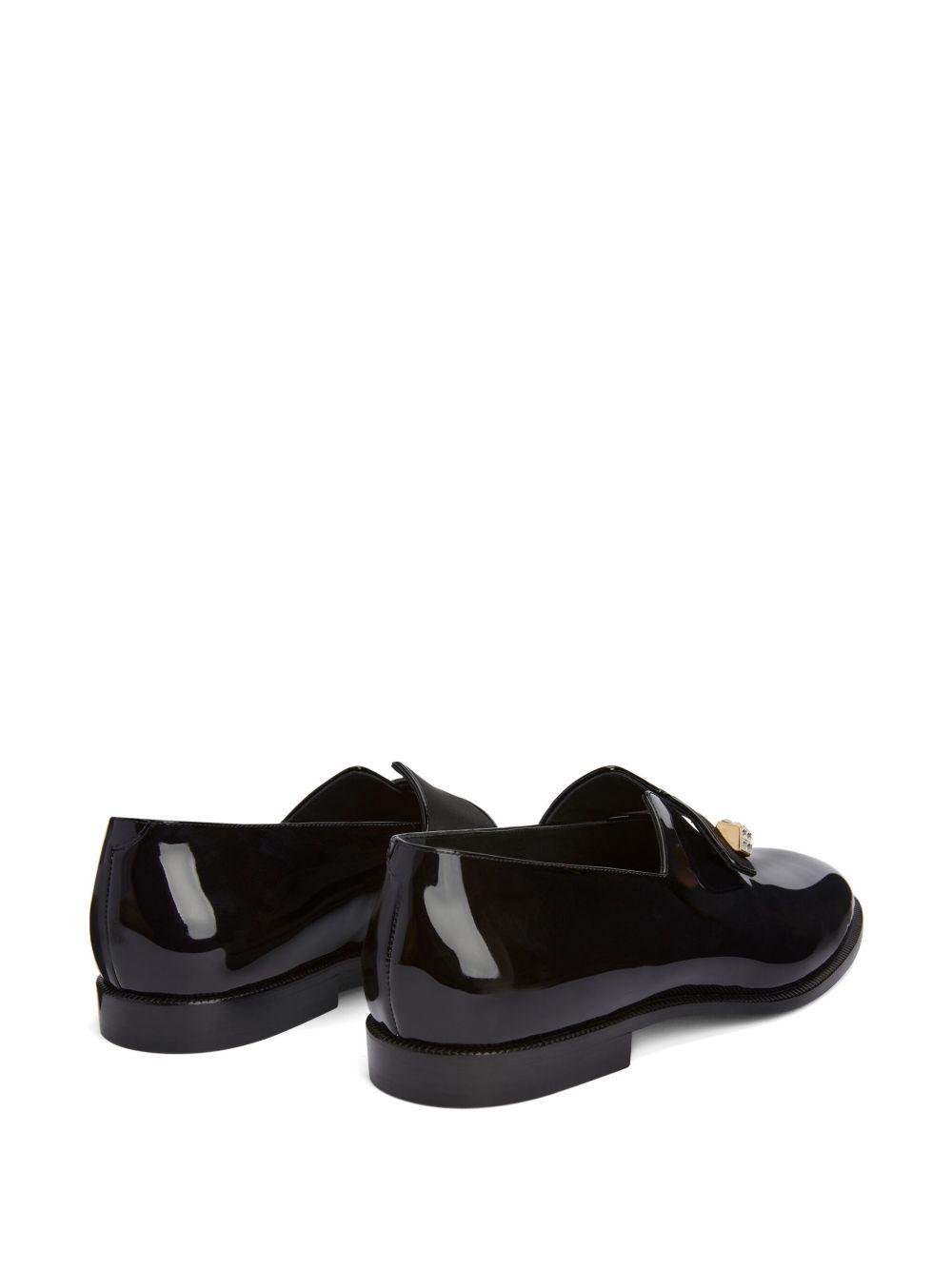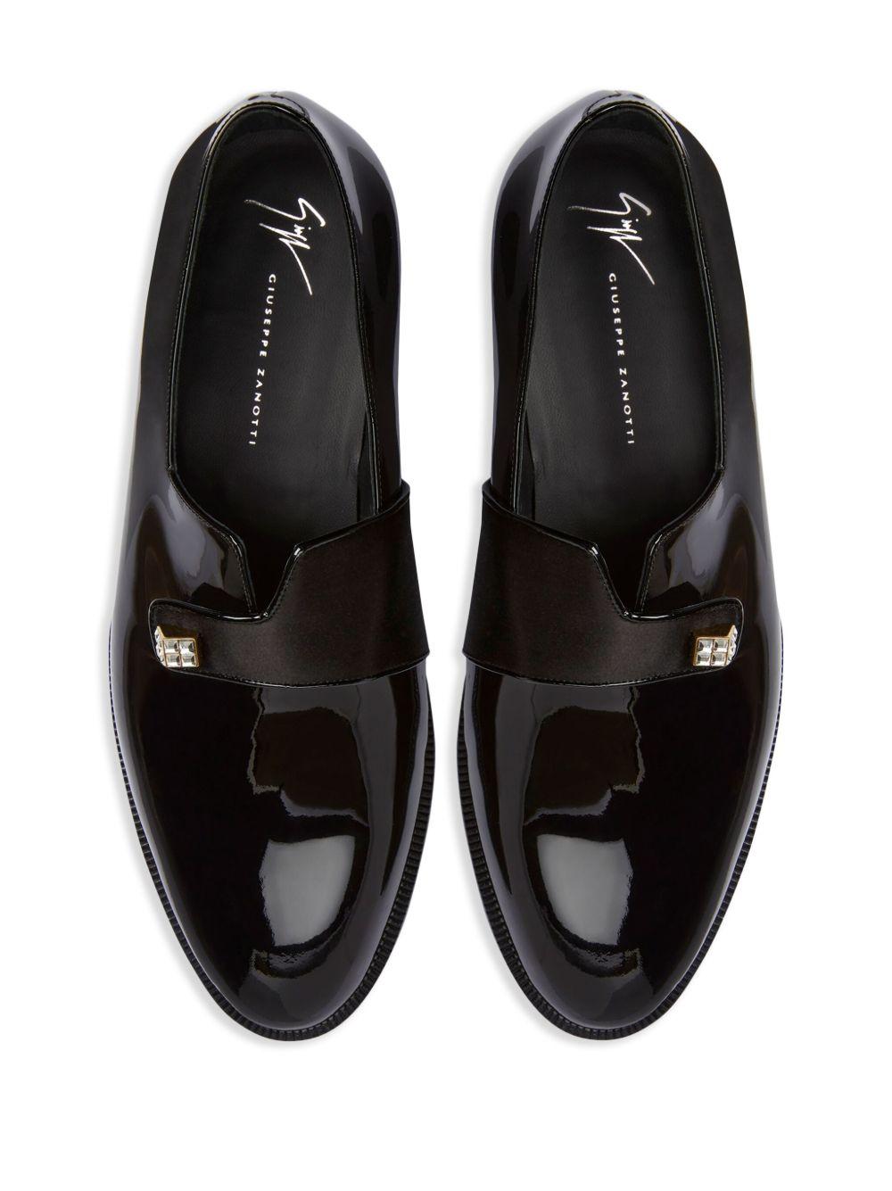 Giuseppe Zanotti Marty patent leather loafers | Black | black | leather | patent finish | crystal embellishment | almond toe | button fastening | branded leather insole | flat leather sole | Leather/Patent Leather/Leather | Loafers | Shoes | Men