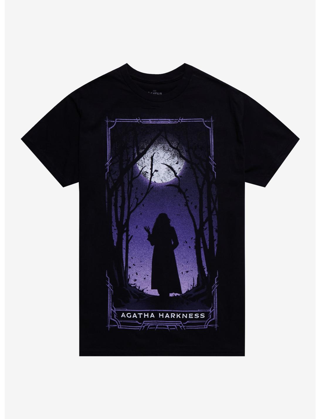 The witch is back! Walk down the Witches' Road with this Agatha All Along tee! Featuring a purple tarot card-inspired design depicting Agatha's silhouette in the middle of a moonlit forest.100% cottonWash cold; dry lowImportedListed in men's/unisex sizes