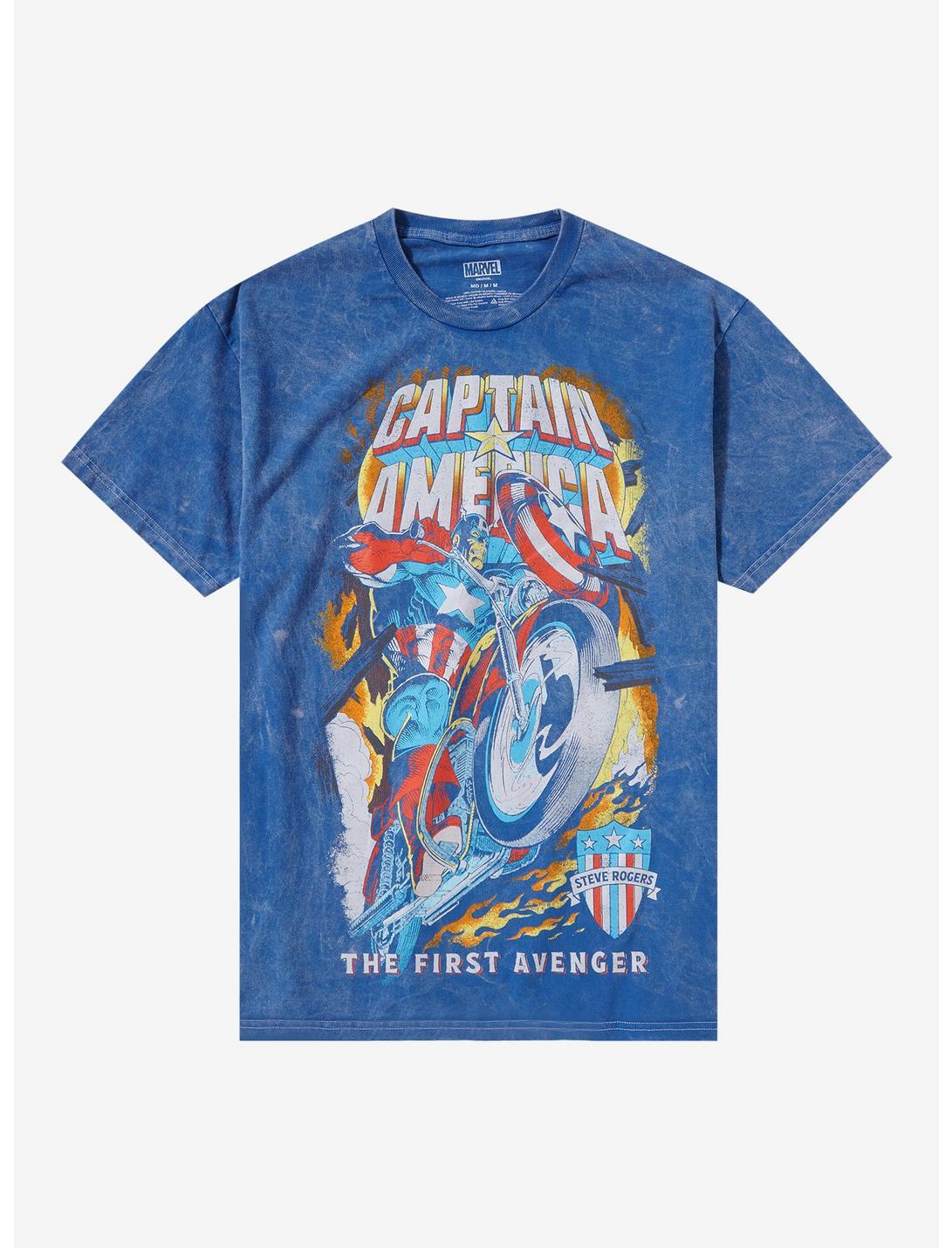 Honor the First Avenger, Steve Rogers, aka Captain America with this tee! It's a mineral-washed style showing a jumbo graphic of Captain America shredding on a motorcycle.Please note: Wash pattern may vary.100% cottonWash cold; dry lowImportedListed in men's/unisex sizes