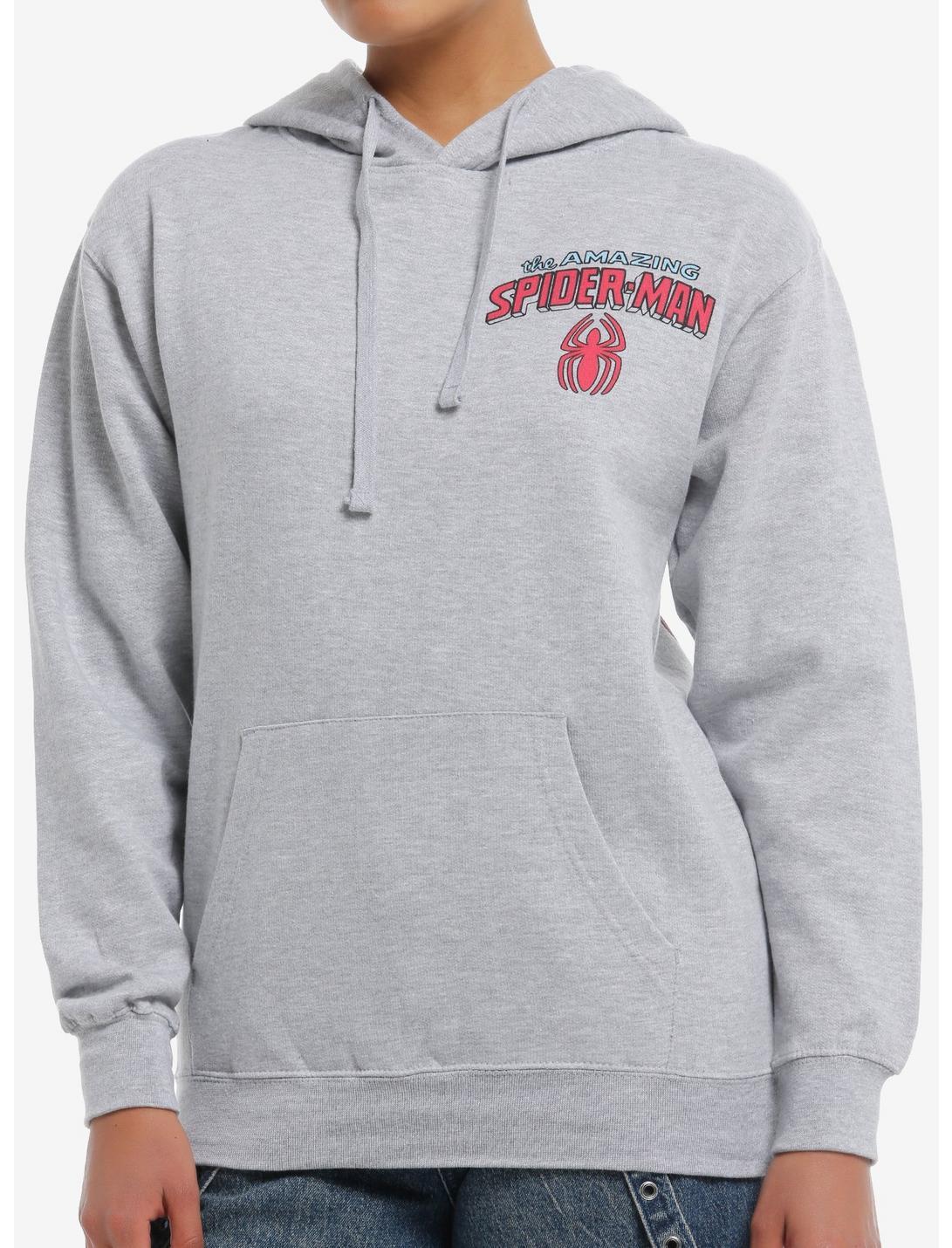 Our Spidey Senses are tingling! Get tangled up in this Spider-Man hoodie! Featuring the logo for The Amazing Spider-Man printed on the chest, plus comic panels and other images of Spidey on the back. Comes with a drawstring hood and kangaroo pocket.55% cotton; 45% polyesterWash cold; dry lowImportedListed in junior sizesModel is 5'9''Model wears size Small