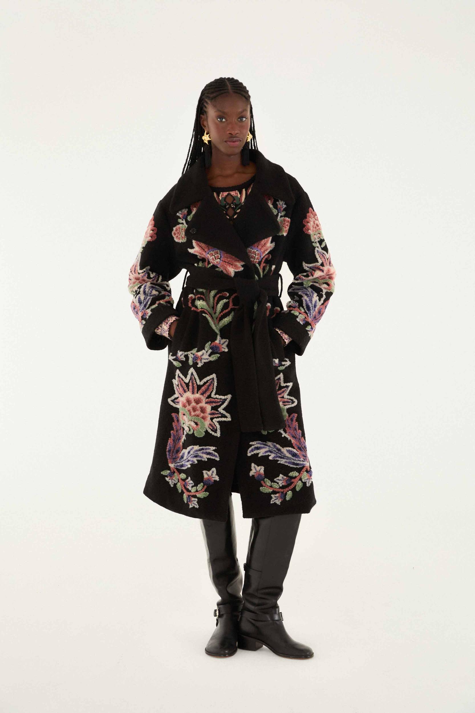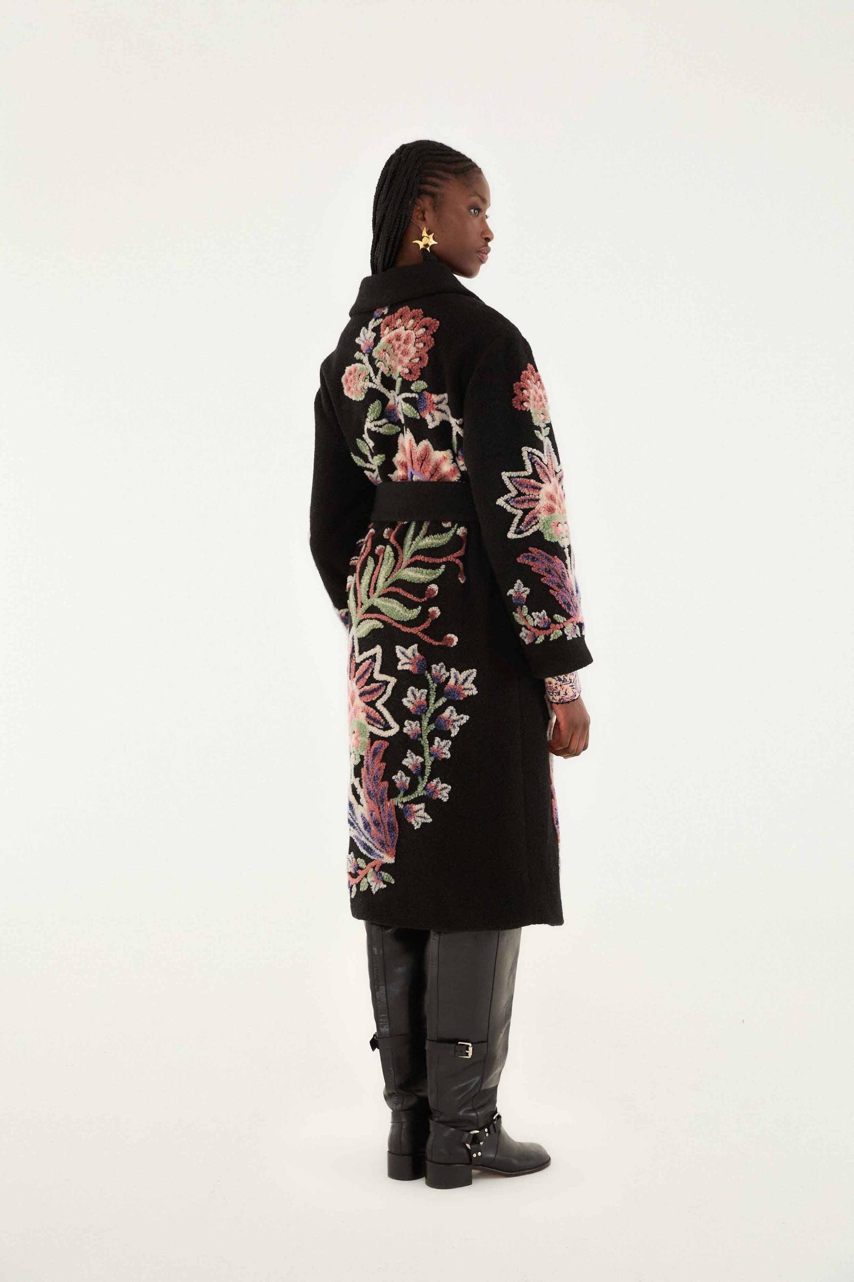 Wrap yourself in the Marvelous Garden Fleece Coat, where bold floral embroidery blooms against a deep black backdrop. This outerwear features a structured collar neckline and a belted waist that sculpts a graceful silhouette. Soft fleece fabric adds warmth, while the vibrant botanical patterns on sleeves and hem evoke a playful garden charm. It’s a statement piece blending cozy comfort with expressive artistry to brighten any chilly day. Pockets: Welt Pockets Sleeve type: Long Sleeve