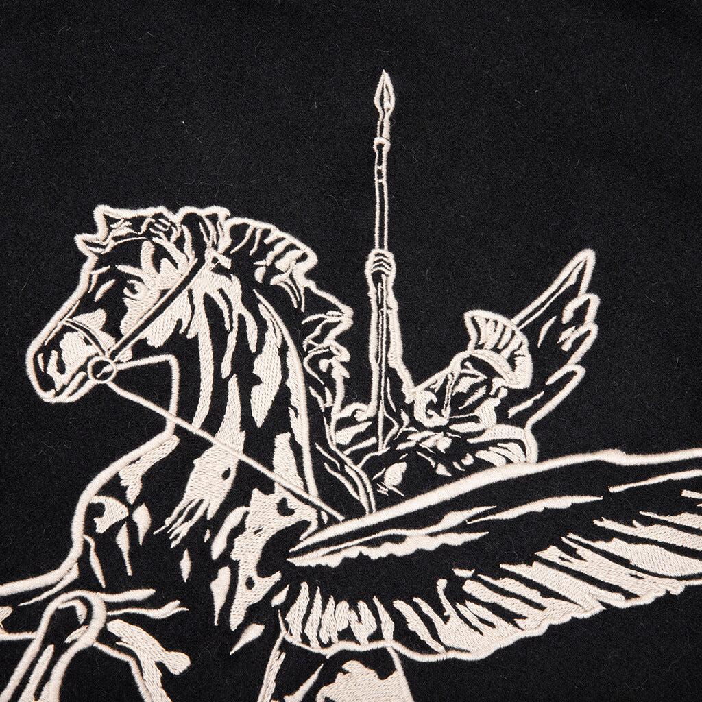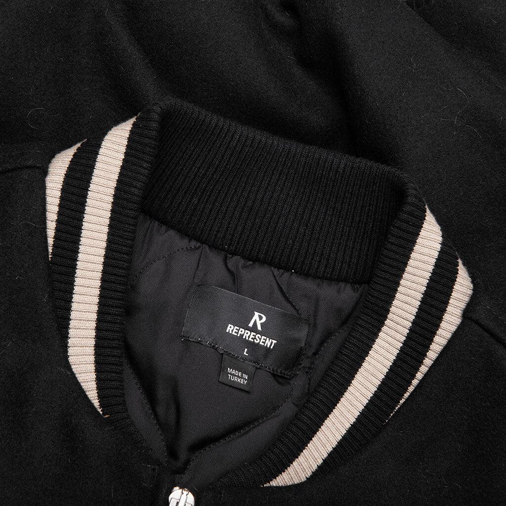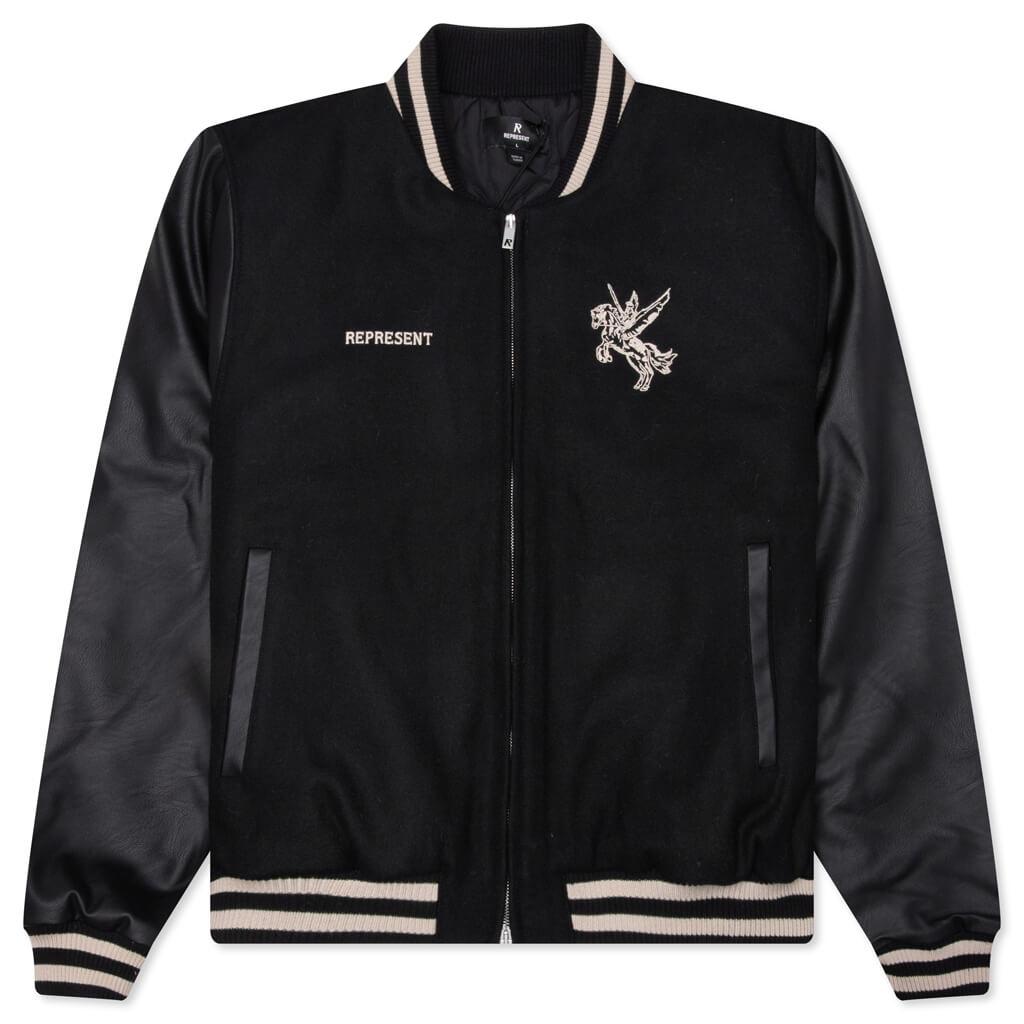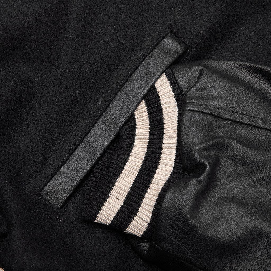 The Mascot Wool Varsity Jacket in Jet Black is crafted from a blend of wool polyamide, providing both warmth and durability. It features faux leather sleeves for a sleek contrast, while the zip closure and rib-knit trims ensure a snug fit. The jacket is designed with two front welt pockets for added functionality and embroidered branding for a stylish finish. 80% Wool, 20% Polyamide Faux Leather Sleeves Zip Closure Rib Knit Trims 2 Front Welt Pockets Embroidered Branding Style No: MLM1127-001