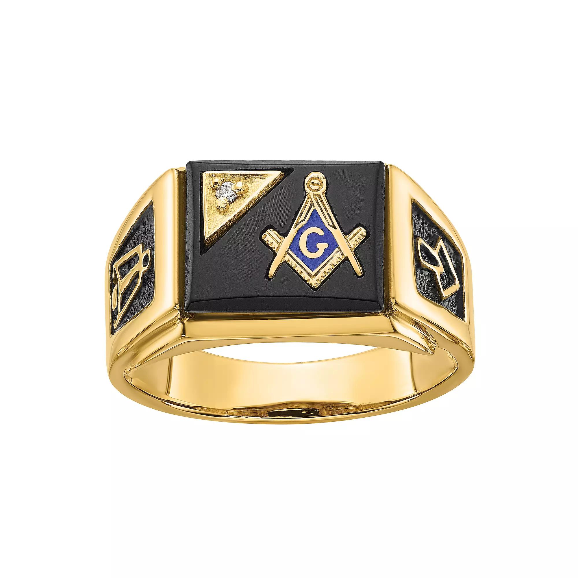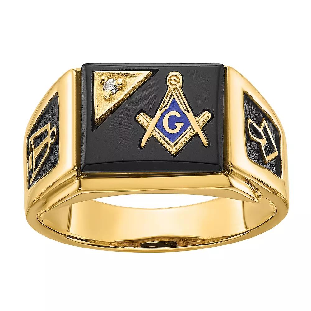 Complete your ensemble with this Masonic Collection onyx and 1/10 carat T.W. diamond Masonic ring. Complete your ensemble with this Masonic Collection onyx and 1/10 carat T.W. diamond Masonic ring. Width: 12 mm Metal: 14k white gold, 14k gold Finish: enameled, textured Packaging: boxedSTONE DETAILS Stone type: onyx Center stone size: 12 mm x 10 mm Shape: cabochonDIAMOND DETAILS Total weight: 1/10 ct. Center stone weight: 1/10 ct. Setting: micro prong Diamond equivalent carat (ct.) Total Weight (T.W.) represents the approximate total weight of diamonds of equivalent appearance. Diamond weights are approximate. Diamond Total Weights may vary between .01 and .13 ct. Some diamonds consist of fewer than 17 facets. Gemstones may have been treated to enhance their appearance. Special care may be required. Please visit our Gemstone Treatment & Special Care Guide for more information. Image(s) may be enlarged to show detail. Size: 9. Color: Yellow. Gender: male. Age Group: adult.