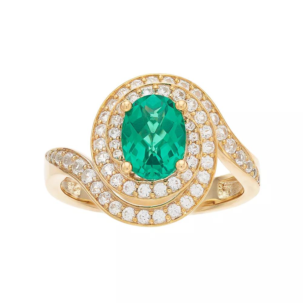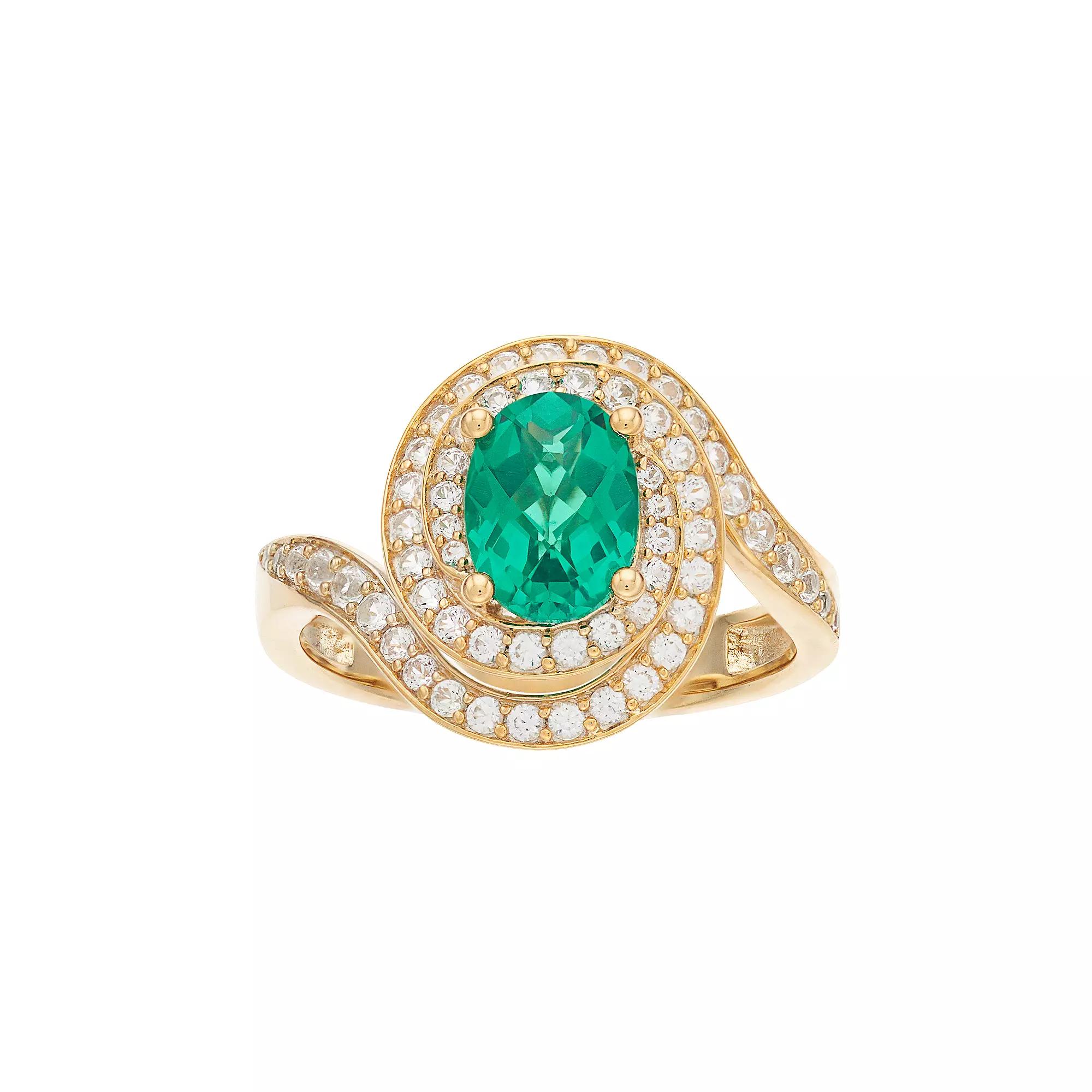 Adorned with an oval-cut, lab-created emerald center stone encircled with lab-created white sapphire accents, this halo ring is simply exquisite. RING DETAILS Width: 0.57 in. Metal: sterling silver Plating: 14k gold Finish: polished Packaging: boxed STONE DETAILS Stone type: lab-created emerald, lab-created white sapphire Total weight: 1 1/2 ct. Center stone weight: 9/10 ct. Center stone size: 8 mm x 6 mm Shape: oval, round Setting: prong Gemstones may have been treated to enhance their appearance. Special care may be required. Please visit our Gemstone Treatment & Special Care Guide for more information. Color: Green. Gender: female. Age Group: adult. Material: Gold Over Sterling.