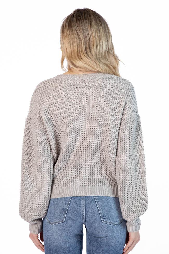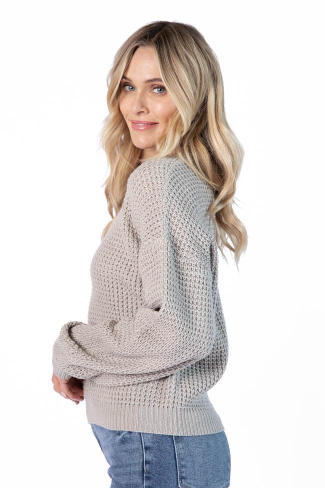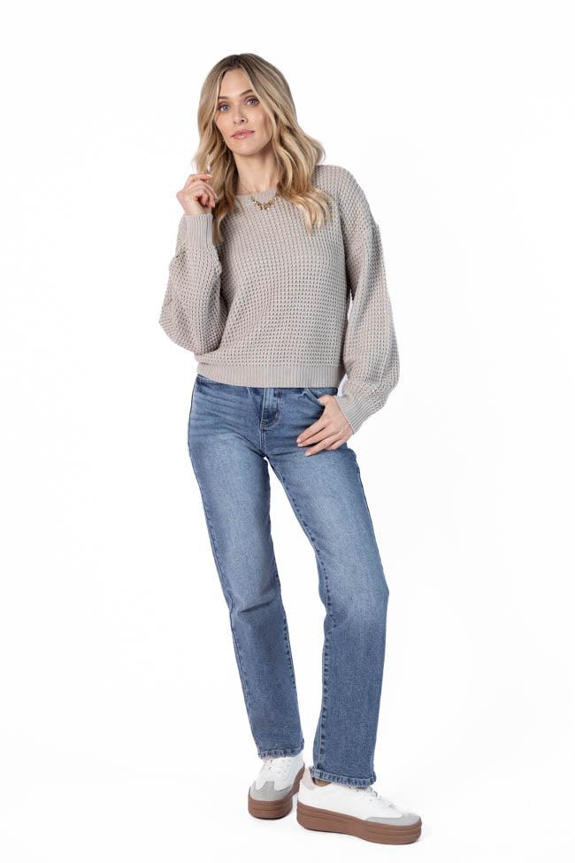 Details Taupe Textured Crew Neck Sweater Fabric has stretch Crew neckline, ribbed hem, long sleeves Unlined Size small from shoulder to hem: 20" Material and Care 100% acrylic Hand wash cold, no drum drying Patterns may vary Materials may have natural variations Colors may vary from different viewing devices.