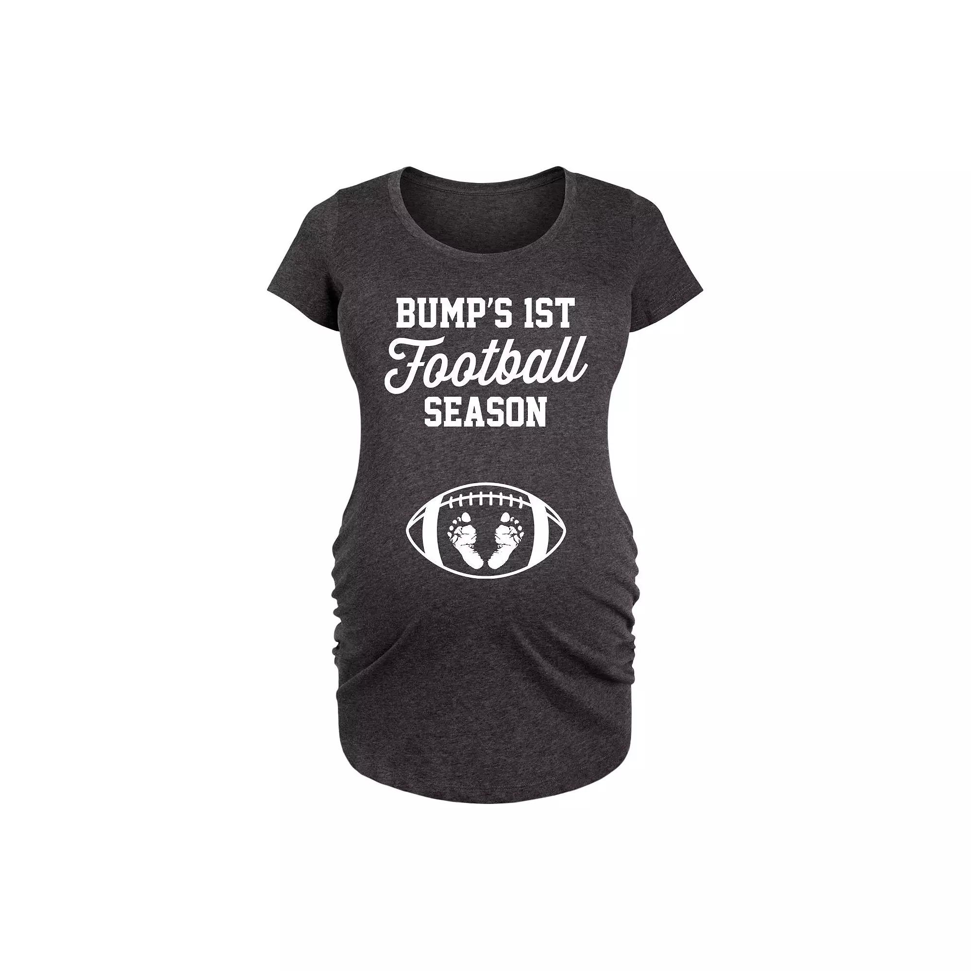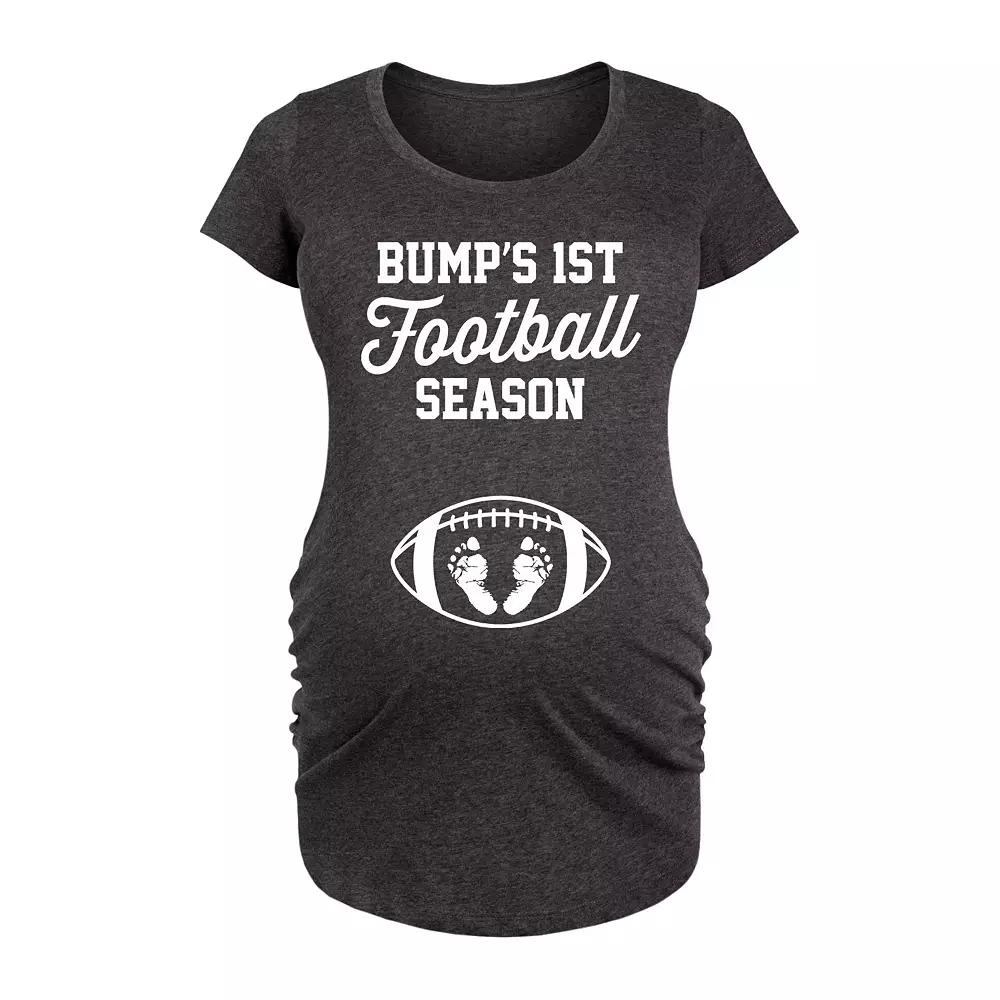 Heather Charcoal 1st Football Season Maternity Scoop Neck Tee. When everyone huddles around the bump, this lightweight tee is sure to get a laugh. A soft cotton-blend promises lasting comfort all game day.Full graphic text: Bumps 1st football seasonSide ruched detail50% polyester/ 25% cotton/ 25% rayonMachine wash; tumble dryImported, screen printed in the USA