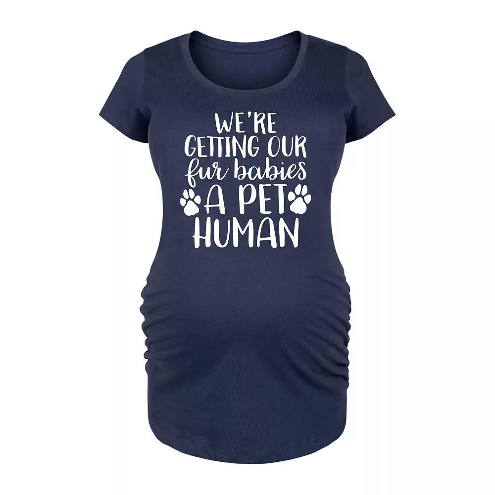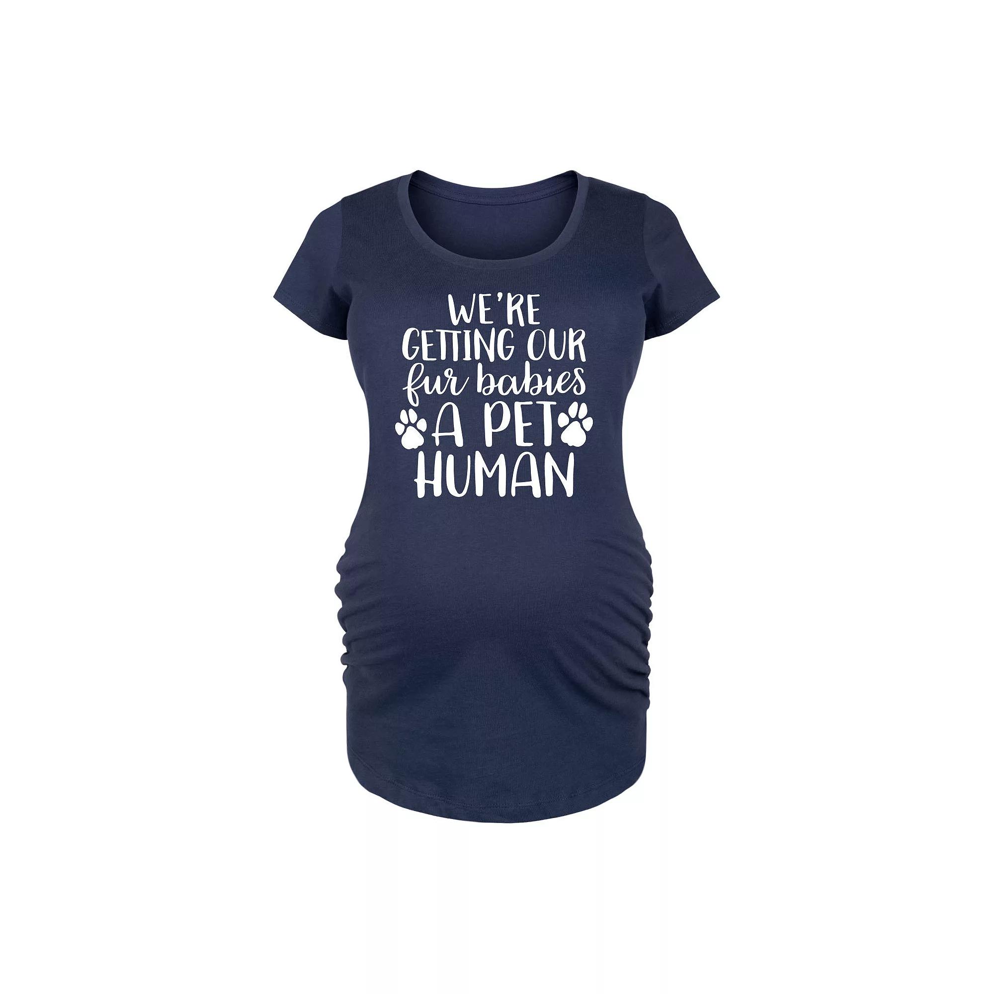 Navy Pet Human Maternity Scoop Neck Tee. Stay comfortable from trimester to trimester in this soft cotton tee. Side ruching gently hugs your curves and accentuates your growing baby bump.Full graphic text: Were getting our fur babies a pet humanSide ruched detail100% combed ringspun cottonMachine wash; tumble dryImported, screen printed in the USA