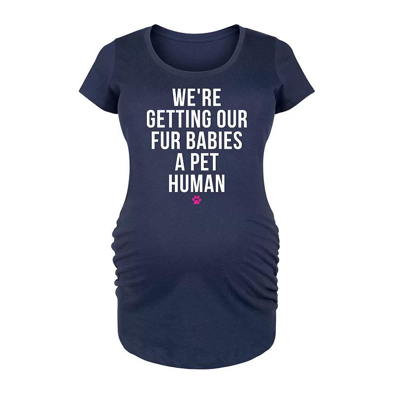 Navy A Pet Human Maternity Scoop Neck Tee. Crafted from soft combed cotton featuring a flattering, deep scoop neck and ruched sides, this pretty graphic side-ruched tee contours your curves with comfort and playful style.Full graphic text: Were getting our fur babies a pet humanSide ruched detail100% combed ringspun cottonMachine wash; tumble dryImported, screen printed in the USA