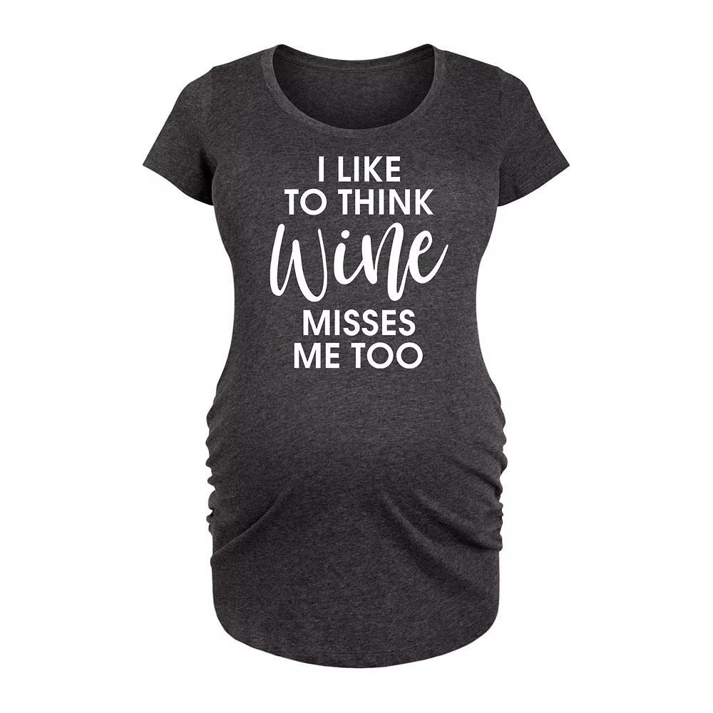 Heather Charcoal Wine Misses Me Too Maternity Scoop Neck Tee. Celebrate this special time with this witty graphic tee made from soft combed ringspun cotton and featuring side ruching for a bunp-loving fit. Full graphic text: I like to think wine misses me, tooSide ruched detail50% polyester / 25% cotton / 25% rayonMachine wash; tumble dryImported, screen printed in the USA