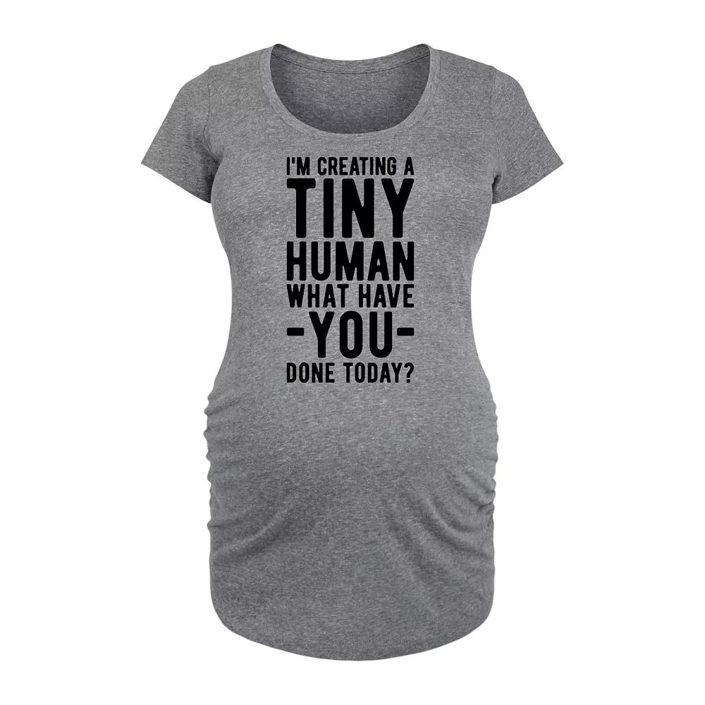 Heather Gray Im Creating A Tiny Human Maternity Scoop Neck Tee - Women. Classic cotton-blend crafted tee with a bump-flattering fit. A cheerful graphic is sure to keep positive vibes flowing.Full graphic text: Im creating a tiny human. What have you done lately?Side ruched detail50% cotton / 50% polyesterMachine wash; tumble dryImported, screen printed in the USA