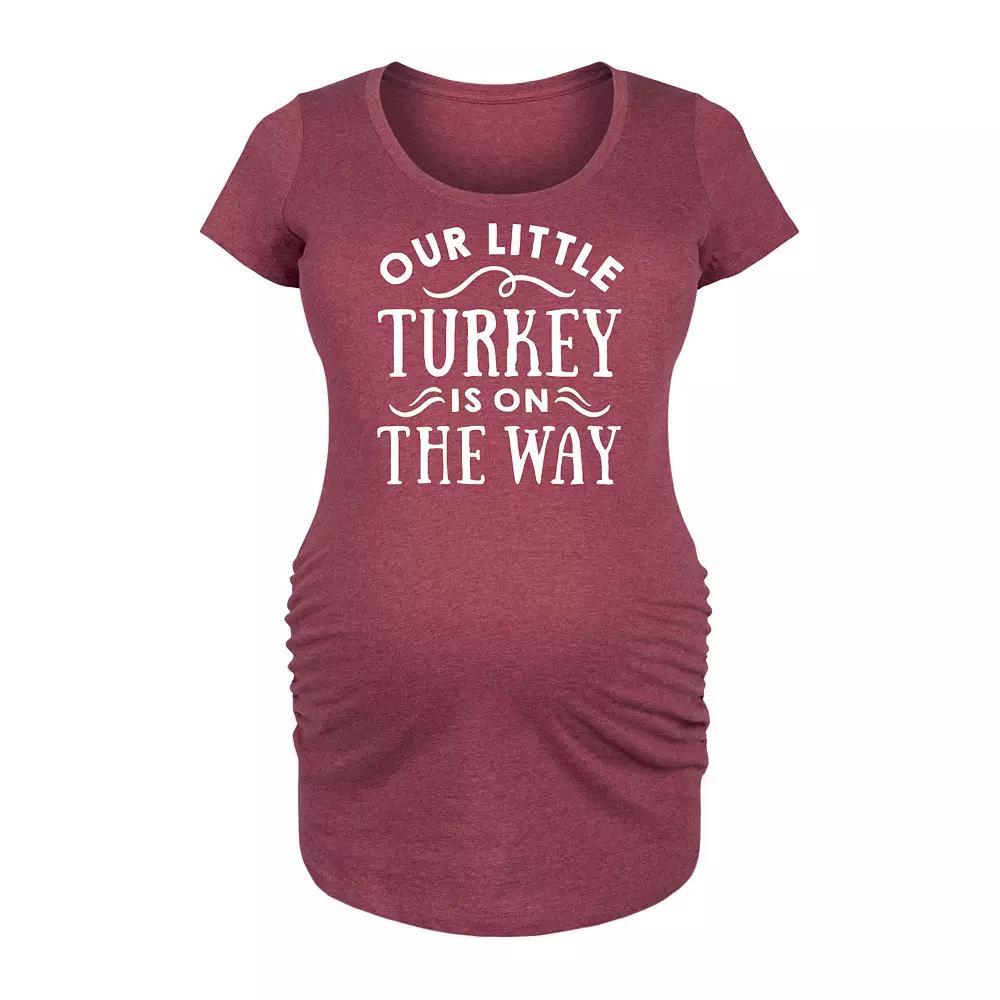 Heather Wine Little Turkey On The Way Maternity Scoop Neck Tee - Women. Maternity tee with a Thanksgiving-themed message and graphics. Scoop neck and side ruching helps provide comfort. Full graphic text: Our little turkey is on the way.Side ruched detail50% cotton / 50% polyesterMachine wash; tumble dryImported, screen printed in the USA