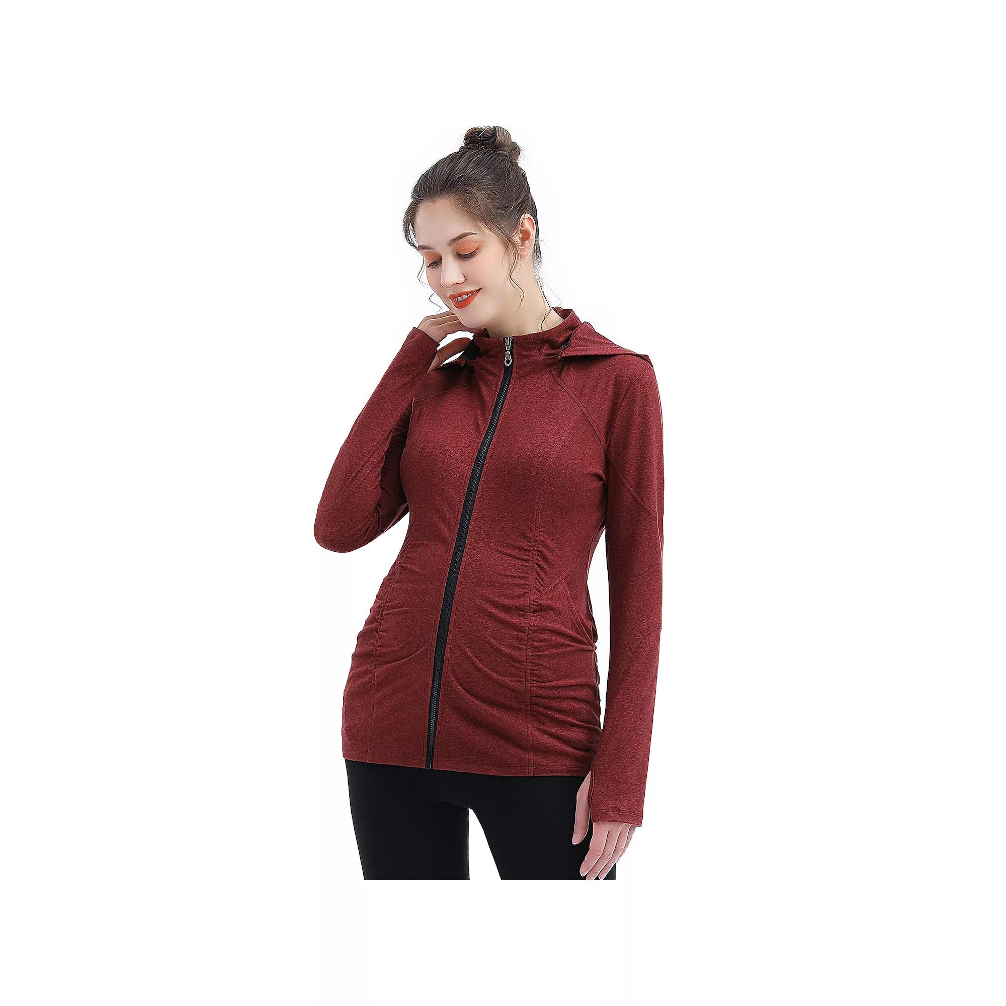 Move through the day in comfortable style with this maternity jacket from Pokkori. Move through the day in comfortable style with this maternity jacket from Pokkori. FEATURES Material is moisture wicking and quick drying Ruching at belly Soft and stretchy fabric 2 pockets Removable hood Zipper closure Thumb holes at cuffs Set-in long sleeves Unlined High neckline Flat lock seam detailsFIT & SIZING 27-in. length from shoulder to hemFABRIC & CARE Polyester, spandex Machine wash Imported Size: S-Mat. Color: Red. Gender: female. Age Group: adult.