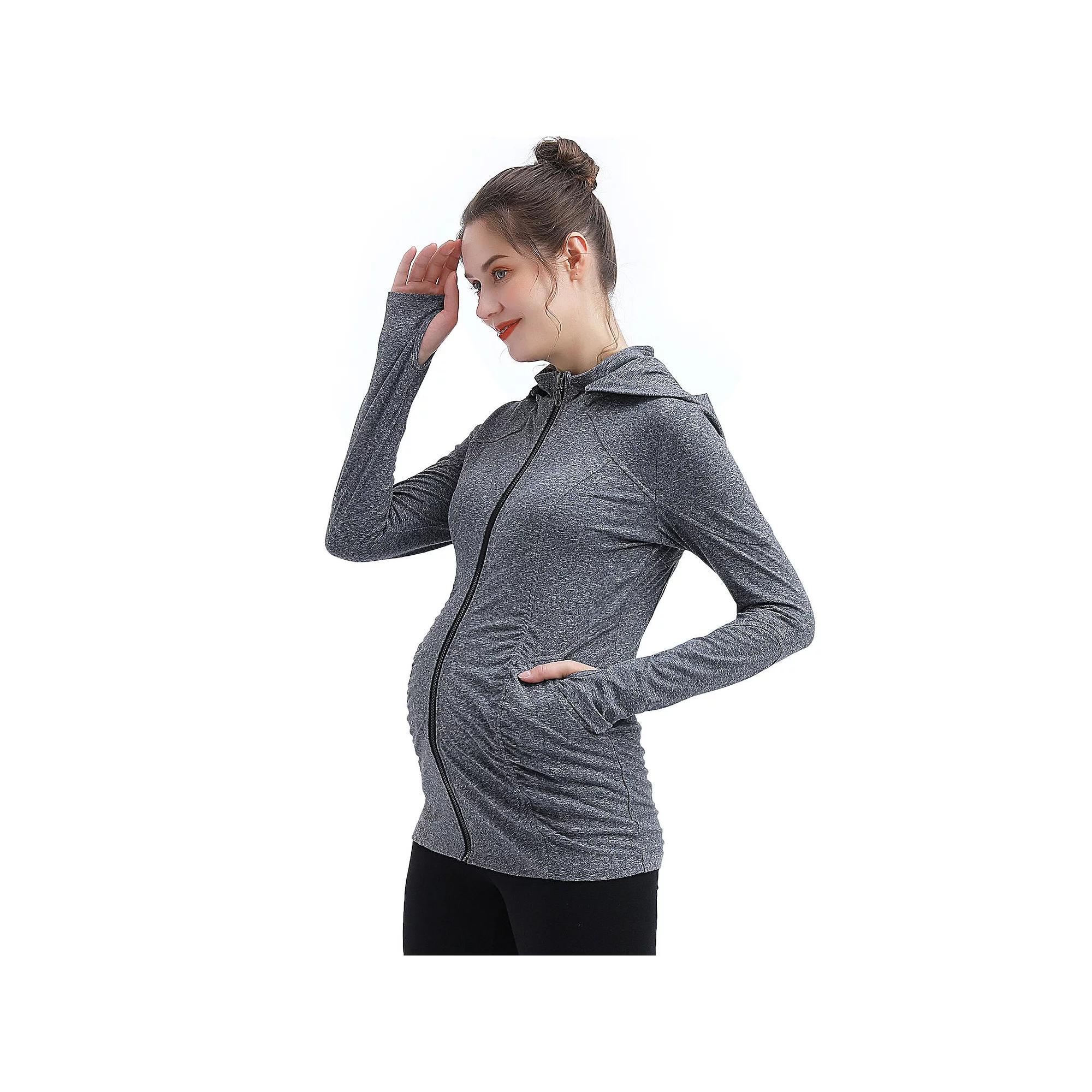 Move through the day in comfortable style with this maternity jacket from Pokkori. Move through the day in comfortable style with this maternity jacket from Pokkori. FEATURES Material is moisture wicking and quick drying Ruching at belly Soft and stretchy fabric 2 pockets Removable hood Zipper closure Thumb holes at cuffs Set-in long sleeves Unlined High neckline Flat lock seam detailsFIT & SIZING 27-in. length from shoulder to hemFABRIC & CARE Polyester, spandex Machine wash Imported Size: XS-MAT. Color: Grey. Gender: female. Age Group: adult.