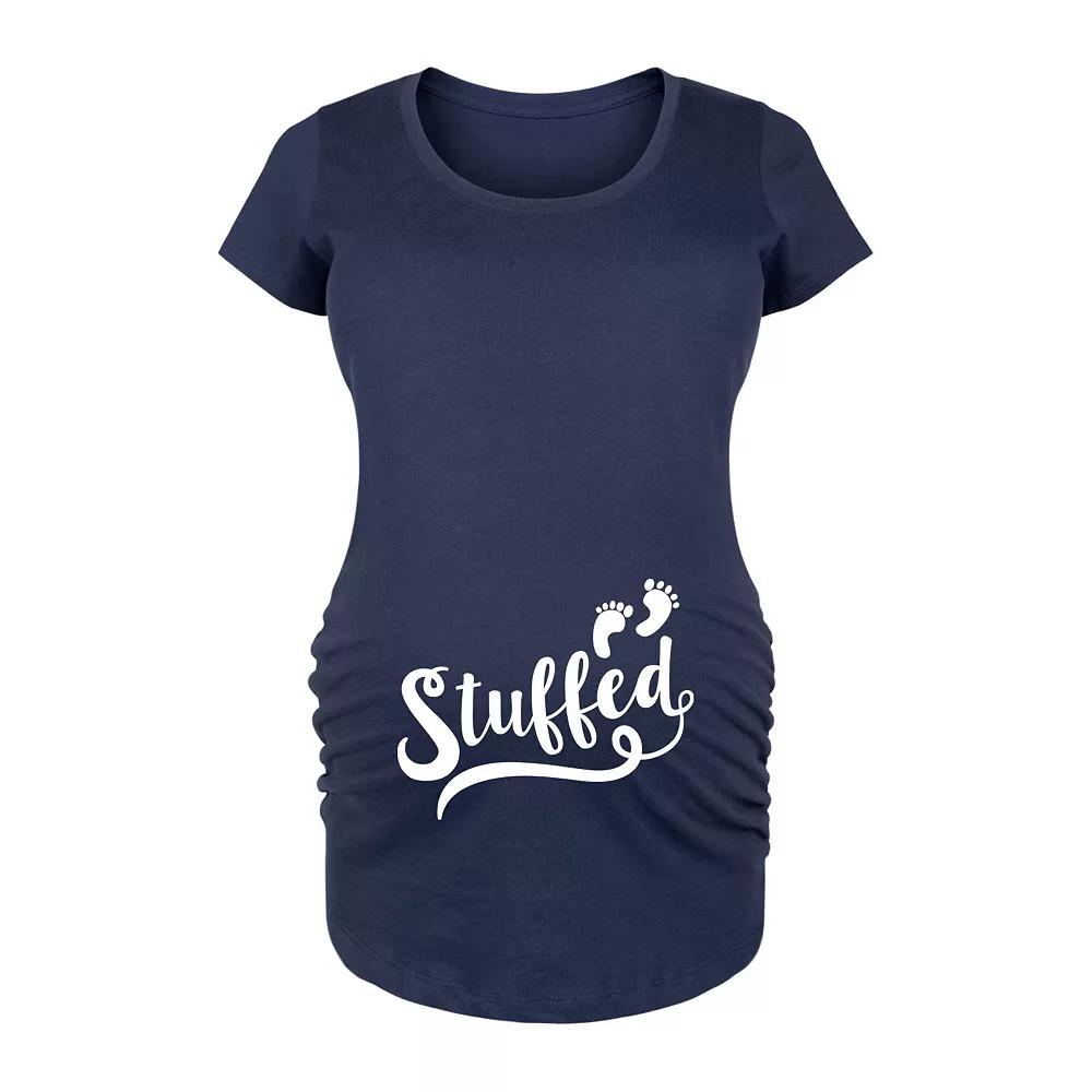 Navy Stuffed Footprints Maternity Scoop Neck Tee. Style this soft cotton tee with sweats or leggings to feast in blissful comfort.Full graphic text: StuffedPrewashedSide ruched detail100% ringspun combed cottonMachine wash; tumble dryImported, screen printed in the USA