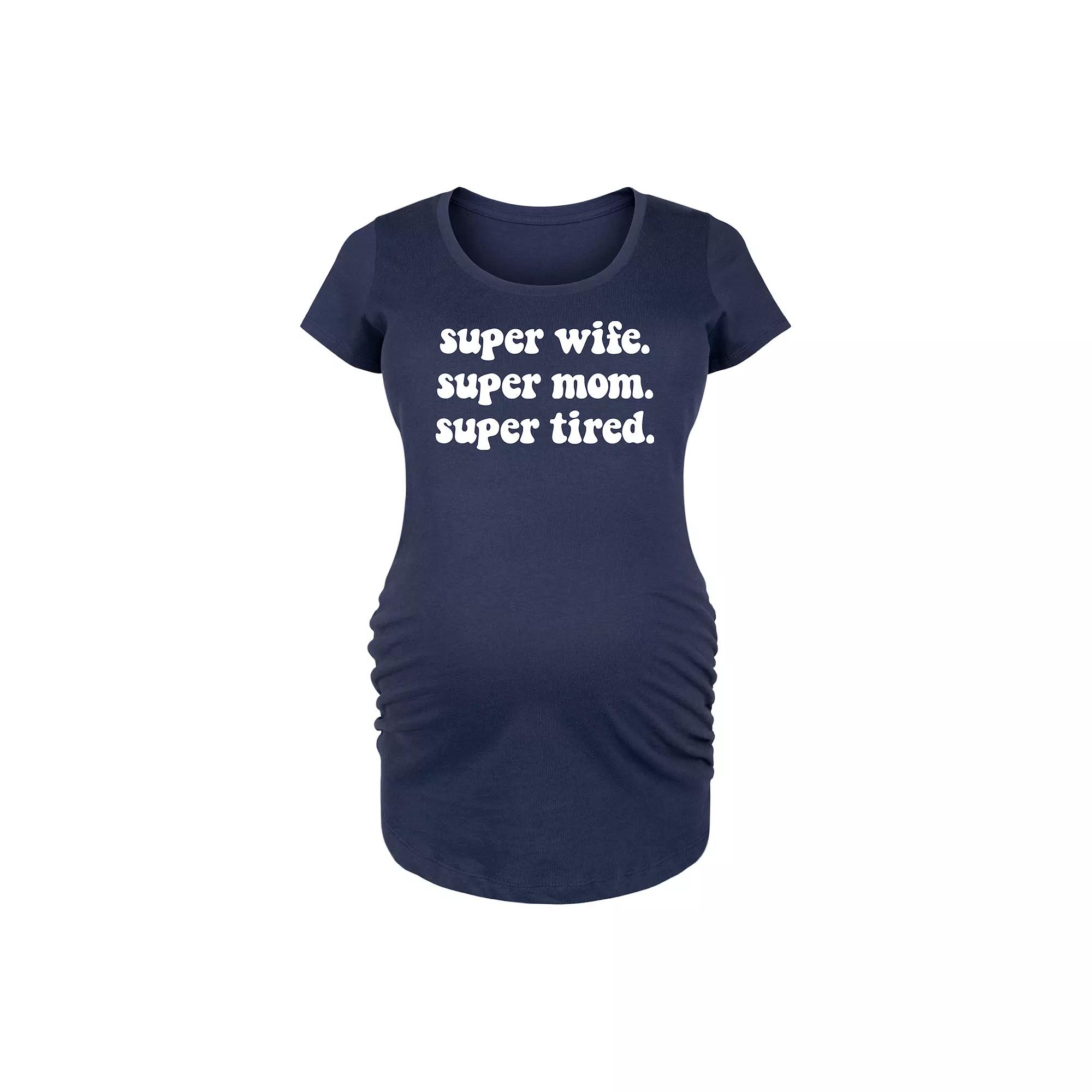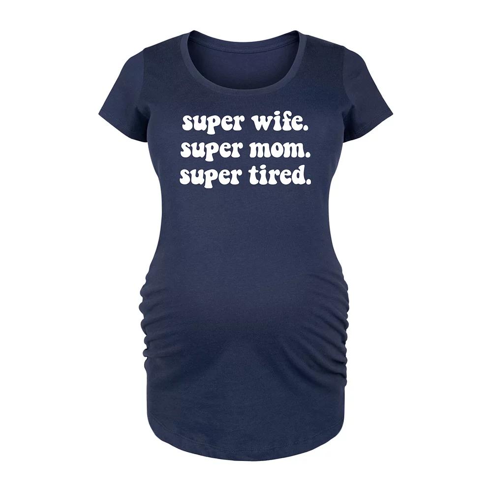 Navy Super Mom, Super Tired Maternity Scoop Neck Tee - Women. Cotton tee complete with a flattering scoop-neck fit, side ruched detail and darling graphic design. Full graphic text: Super wife. Super mom. Super tired.Side ruched detail100% cottonMachine wash; tumble dryImported, screen printed in the USA
