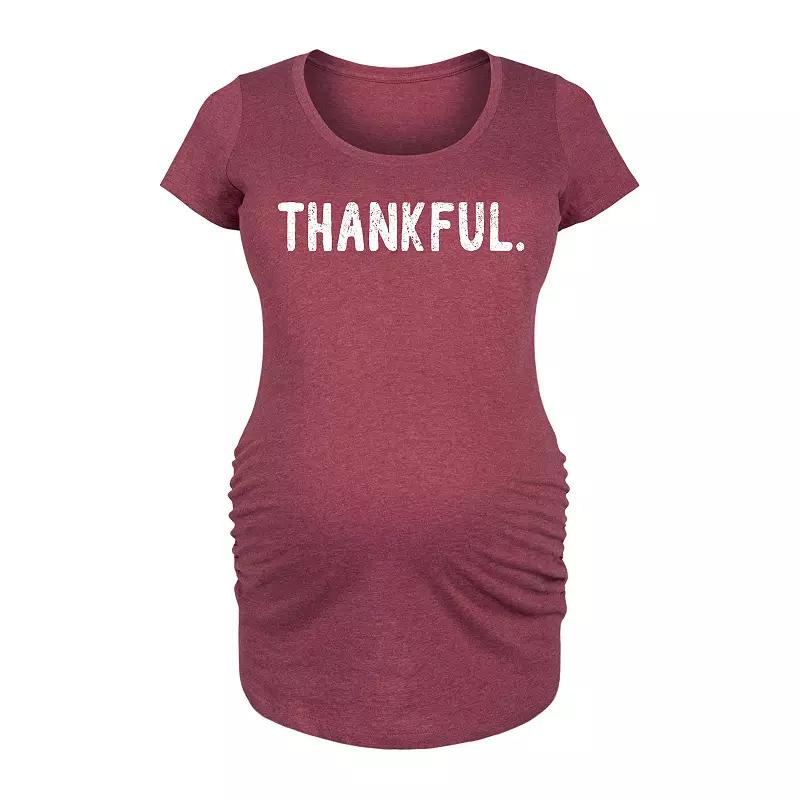 Heather Wine Thankful Maternity Scoop Neck Tee. Give your baby bump the comfort it deserves while flaunting your playful side when you don this supersoft tee ruched at the sides for a cozy fit.Full graphic text: Thankful.Side ruched detail100% combed ringspun cottonMachine wash; tumble dryImported, screen printed in the USA