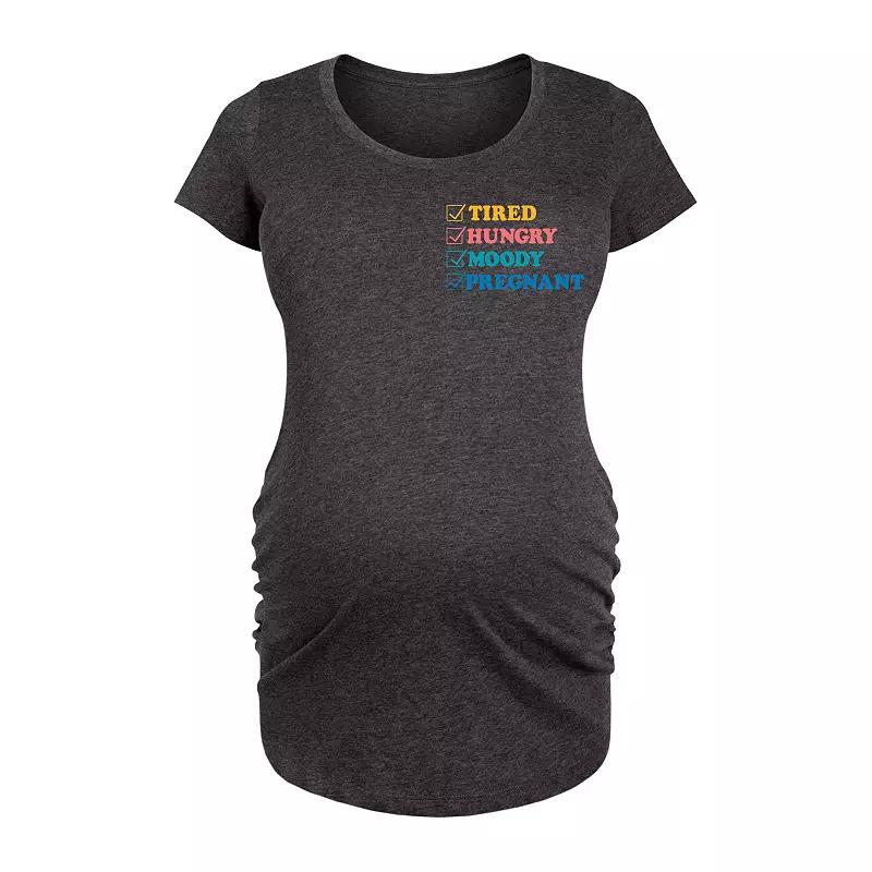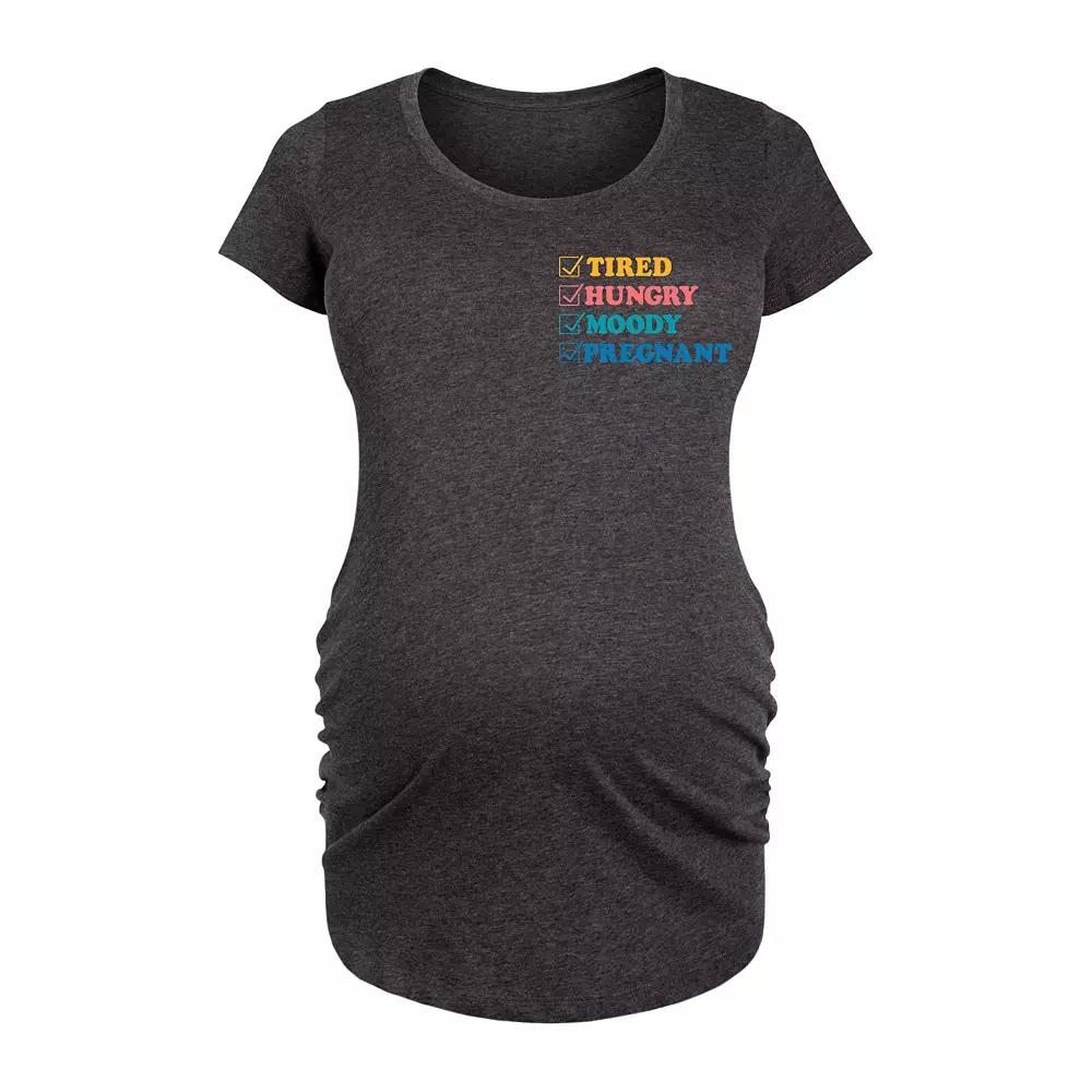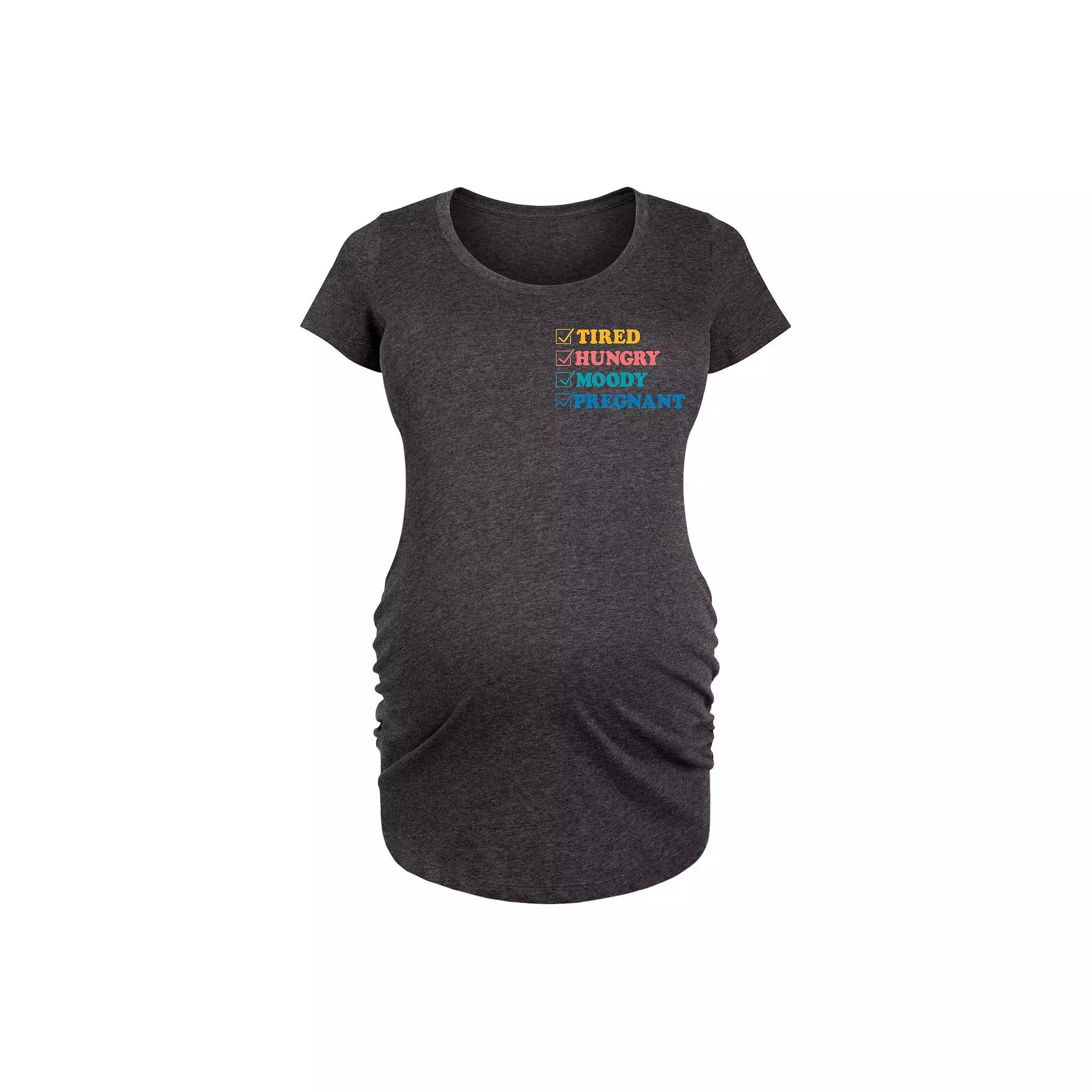 Shell love the look and feel of this Maternity Tired Hungry Moody Pregnant Graphic Tee. Shell love the look and feel of this Maternity Tired Hungry Moody Pregnant Graphic Tee. FEATURES Crewneck Short SleevesFIT & SIZING 34 1/2-in. length from shoulder to hemFABRIC & CARE Solid: Cotton Heather: Cotton/Polyester Machine wash Imported Size: L-Mat. Color: Black. Gender: female. Age Group: adult.