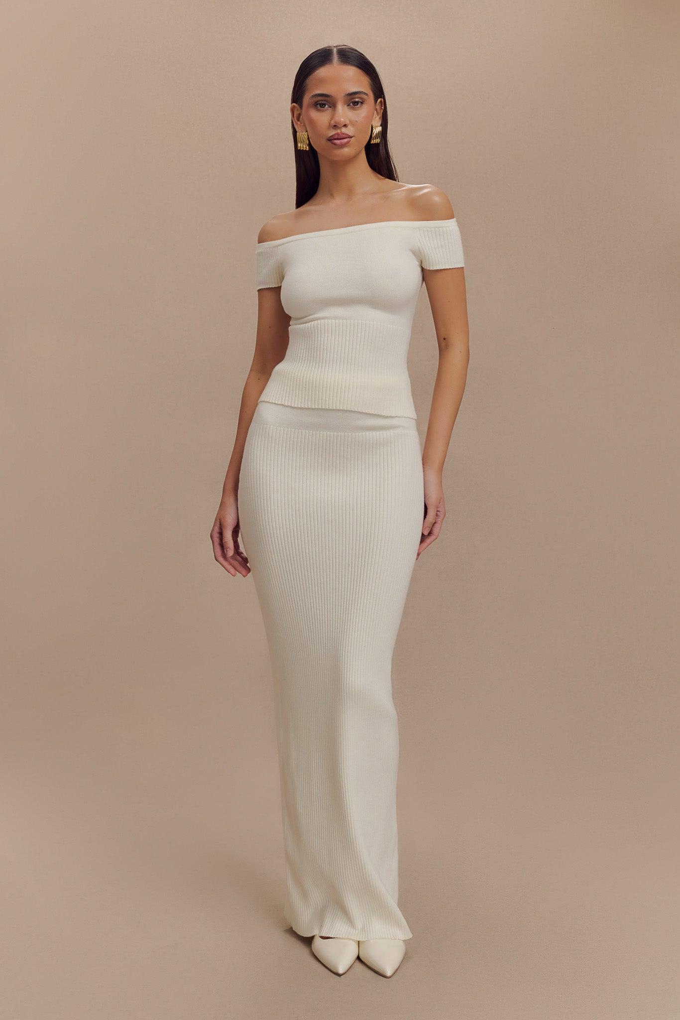 Streamlined chic. The MATHILDE Ribbed Knit Off Shoulder Top is a stylish and contemporary piece that combines elegance with a touch of casual sophistication. Featuring a Bardot neckline and ribbing detail at the sleeves and hem, this top provides a flattering off-shoulder look while ensuring a secure fit with its elasticized neckline. The longline design enhances the silhouette, creating a streamlined and chic appearance. Made from unlined knit fabric for a lightweight feel, the Mathilde Top pairs perfectly with the Mathilde Ribbed Knit Maxi Skirt for a cohesive and fashionable ensemble that effortlessly transitions from day to night.