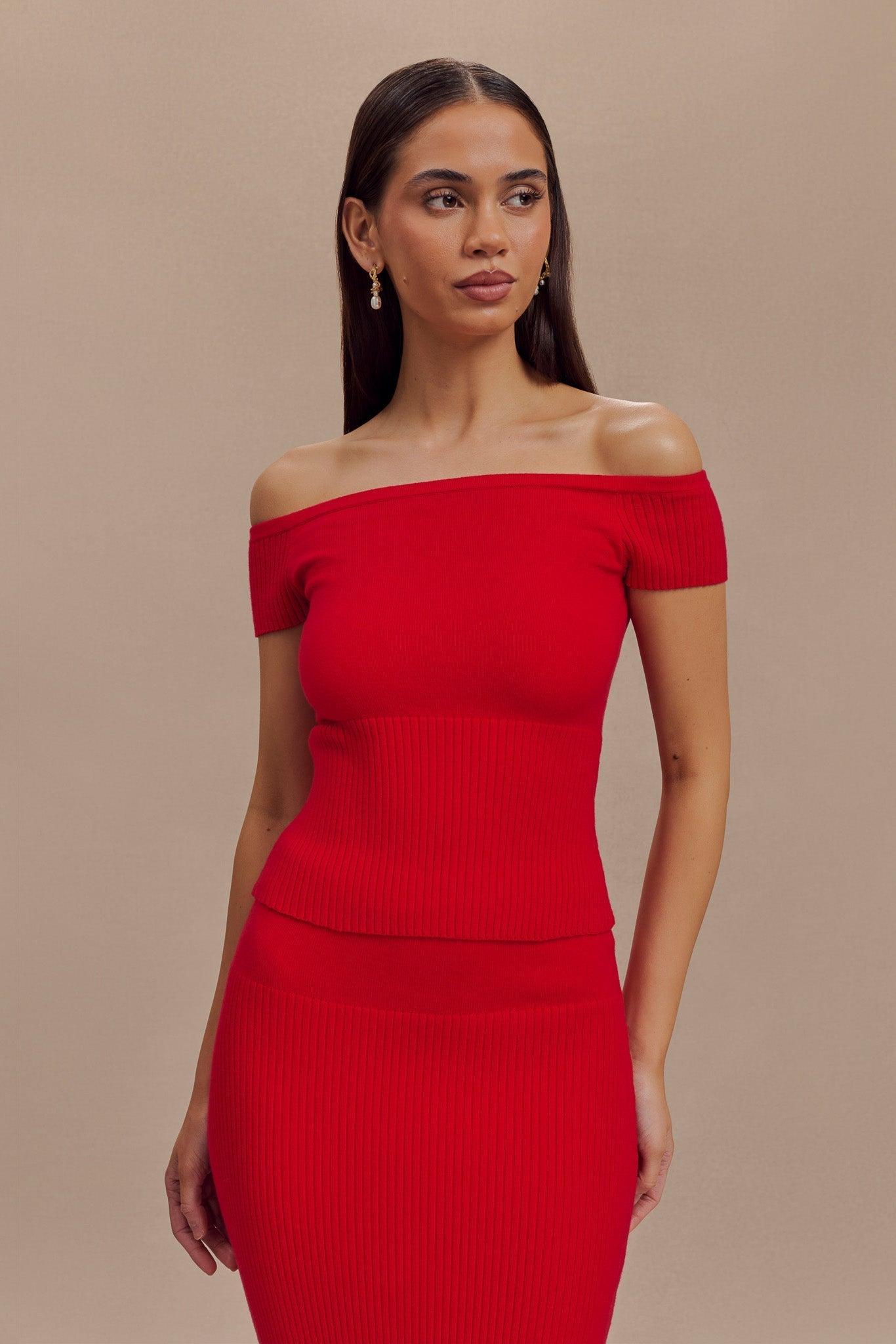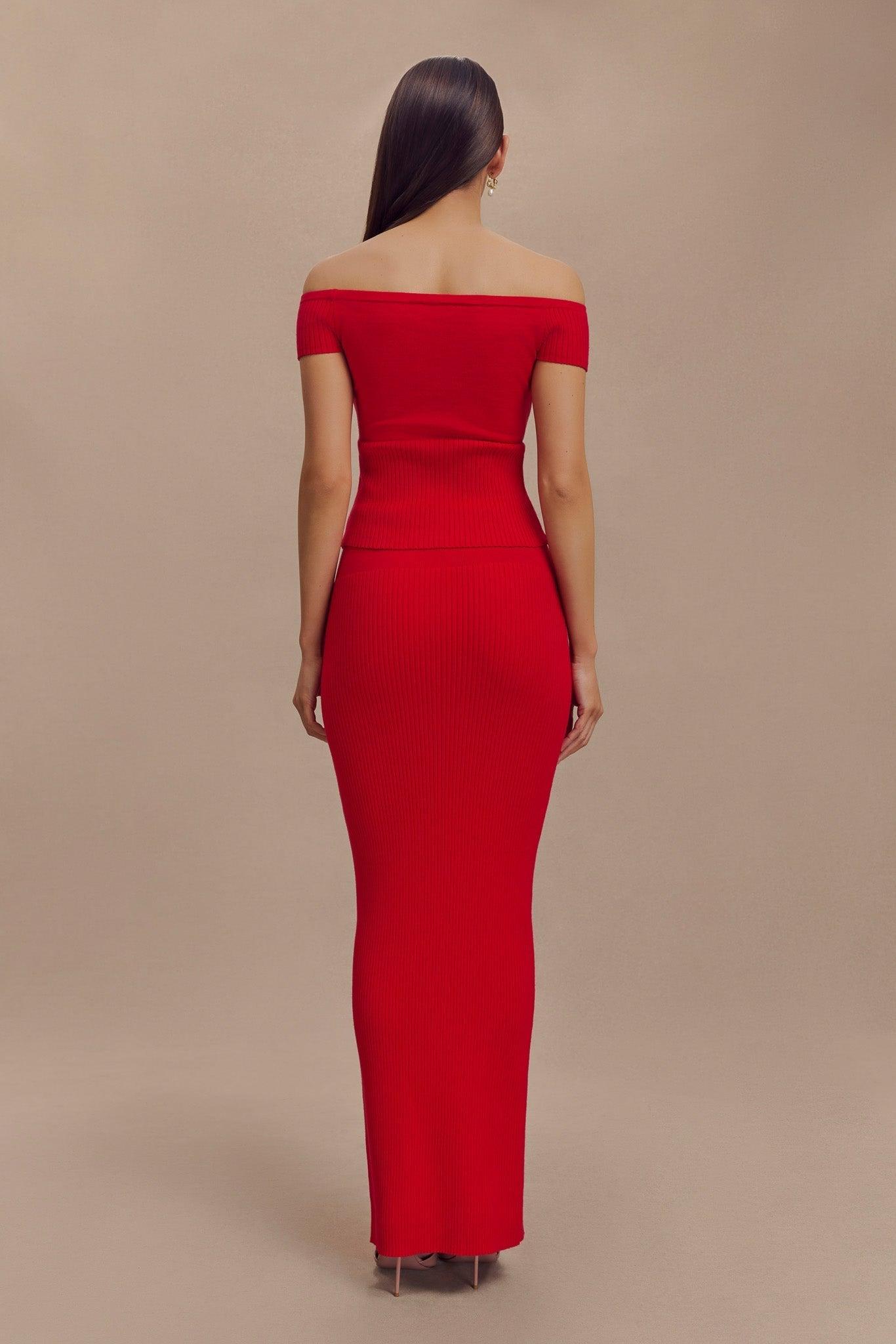 Streamlined chic. The MATHILDE Ribbed Knit Off Shoulder Top is a stylish and contemporary piece that combines elegance with a touch of casual sophistication. Featuring a Bardot neckline and ribbing detail at the sleeves and hem, this top provides a flattering off-shoulder look while ensuring a secure fit with its elasticized neckline. The longline design enhances the silhouette, creating a streamlined and chic appearance. Made from unlined knit fabric for a lightweight feel, the Mathilde Top pairs perfectly with the Mathilde Ribbed Knit Maxi Skirt for a cohesive and fashionable ensemble that effortlessly transitions from day to night.