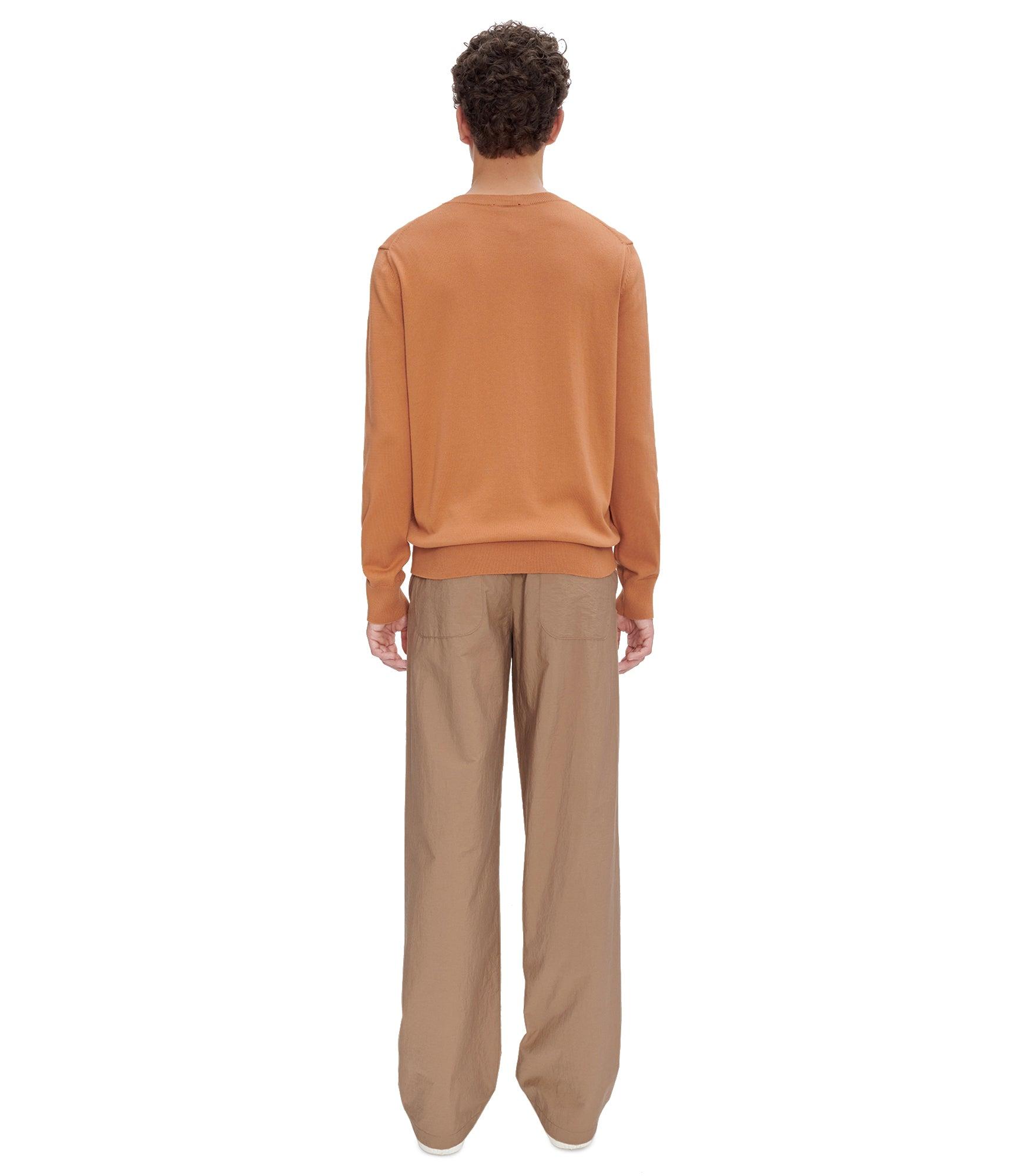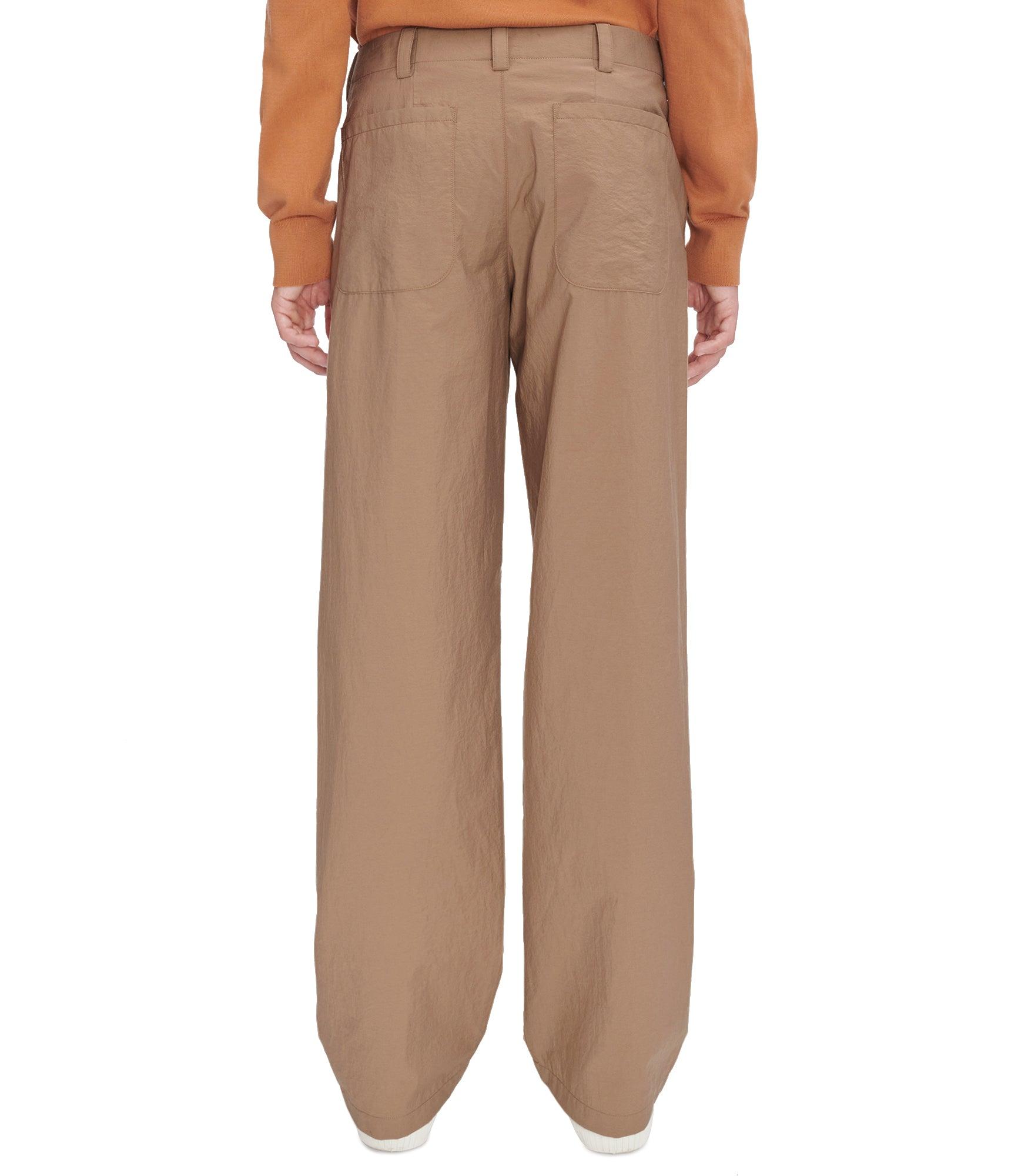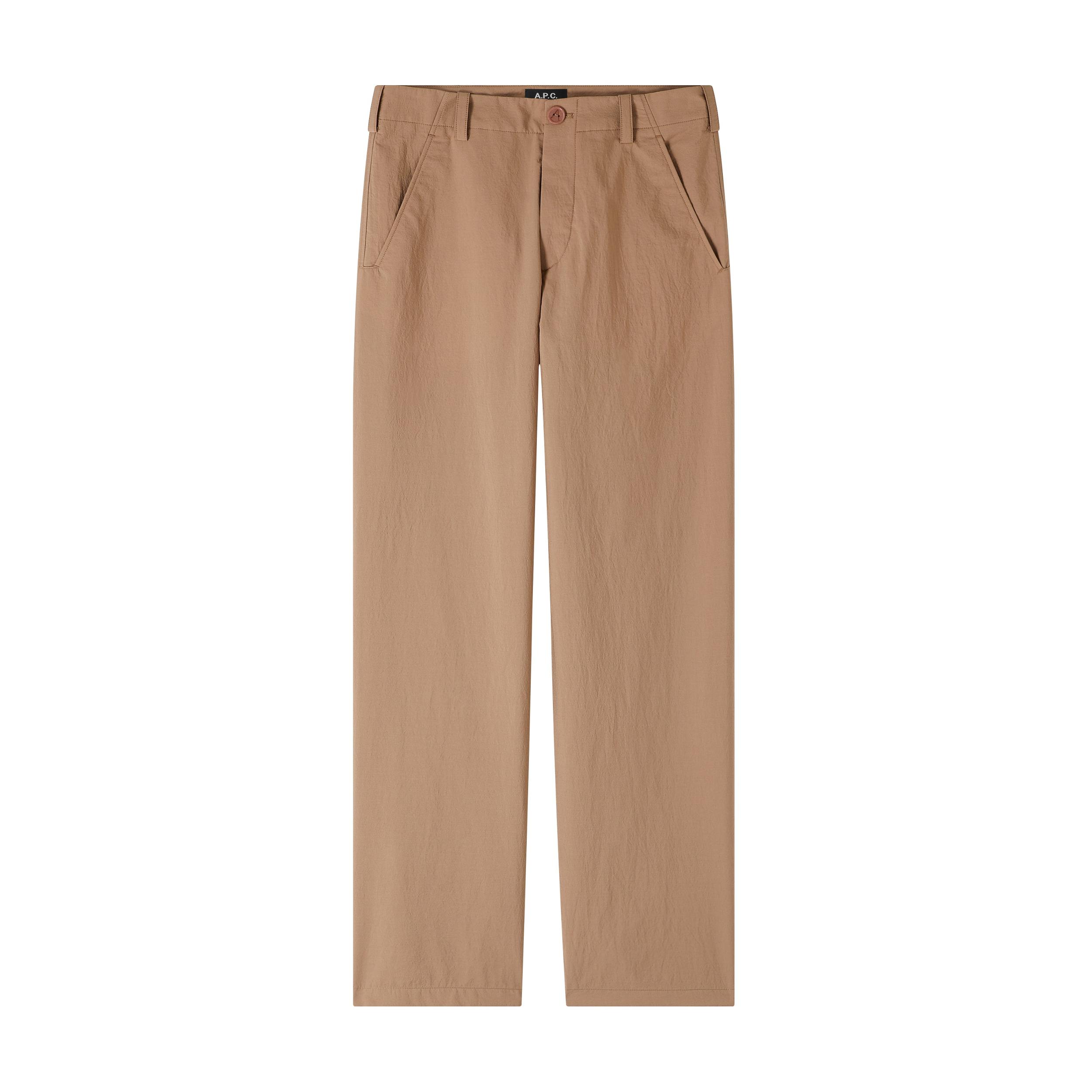 - Soft material with a crinkled aspect, reminiscent of seersucker. - Mid-rise. - Straight cut. - Side and back pockets. - Buttons engraved 'A'. - Zip fly. - May be worn with Melchior jacket.