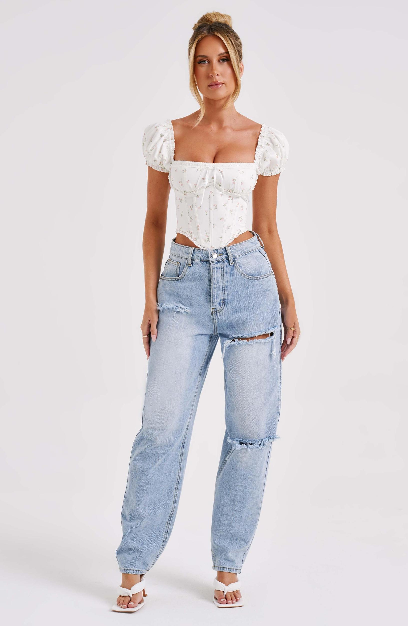 Must-have milkmaid corsets are what we're wearing ALL season with our fave denim and mule heels. Matilda has dreamy puffed sleeves with a snatched waist and pretty tie detail to the bust. Colour: Blush Floral Print. Premium non stretch cotton. Underwired bust. Puffed sleeves. Waist cinching. Tie to bust. Dipped hem. Cropped length. Model is an XS and is wearing an XS.