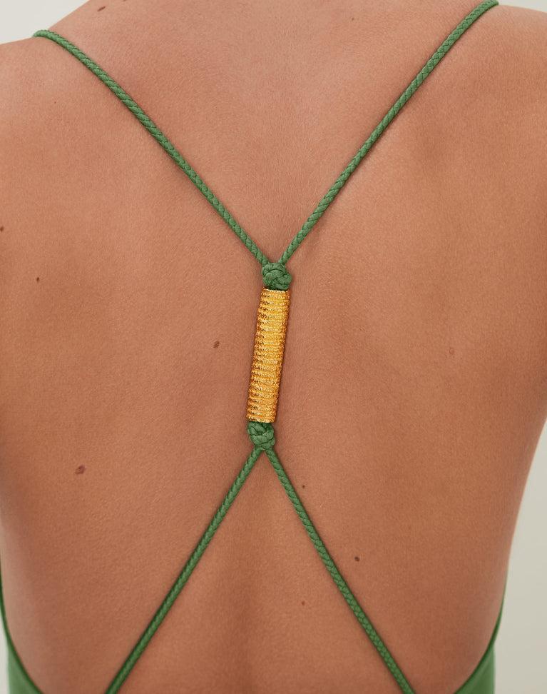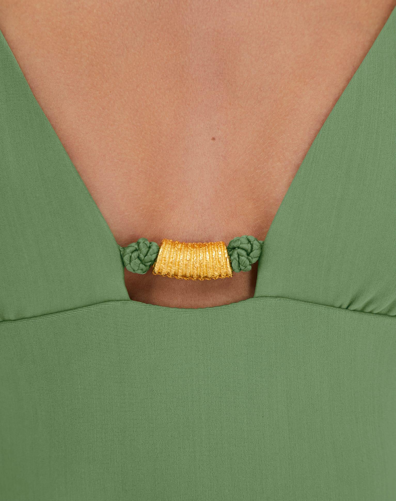 The ViX Stacy One Piece is a striking silhouette designed to turn heads. Featuring a plunging neckline highlighted by the signature Stacy detail, it flows into an open T-back adorned with a coordinating gold accent and the iconic ViX logo—blending bold elegance with timeless appeal. Style the Stacy One Piece with a mat