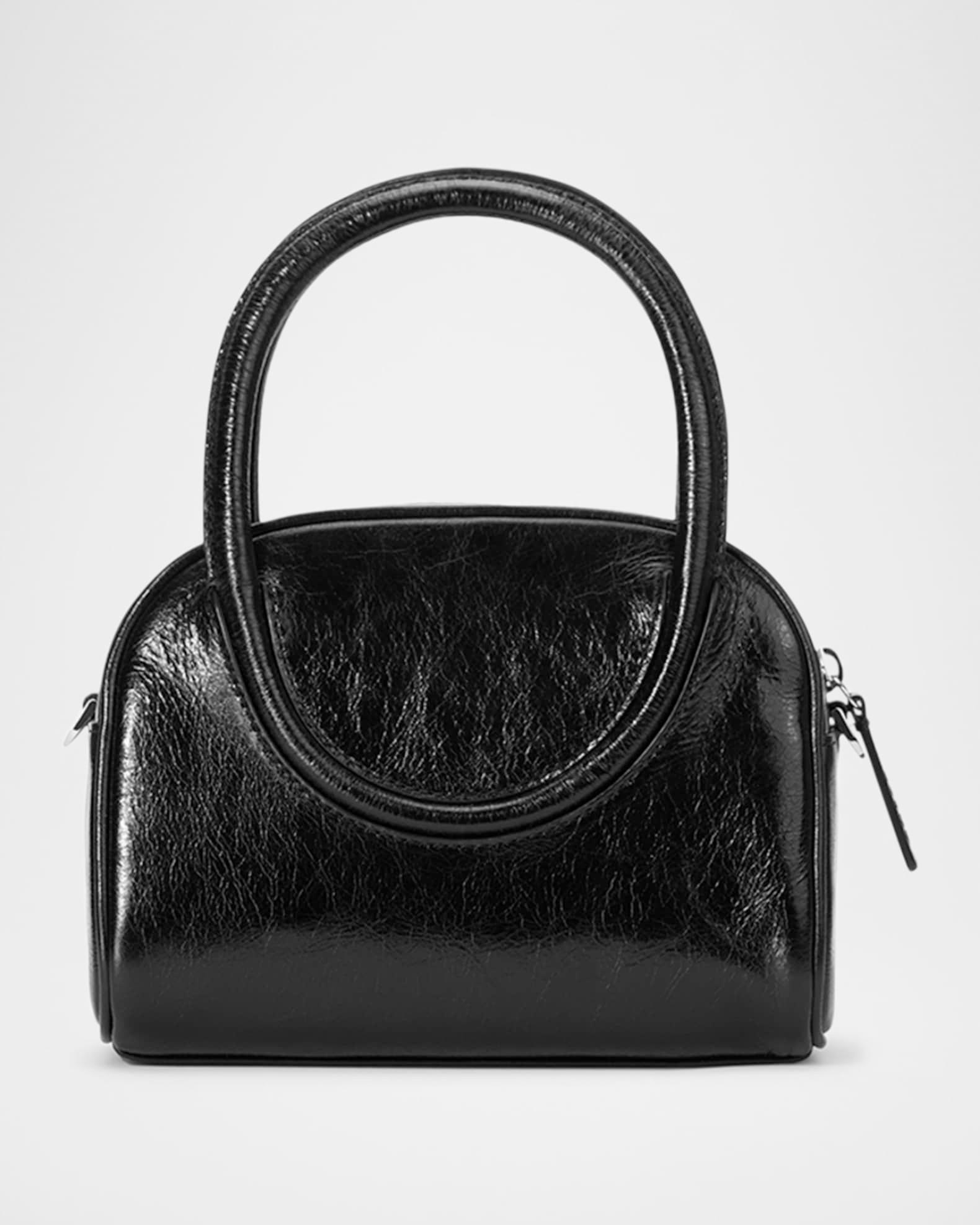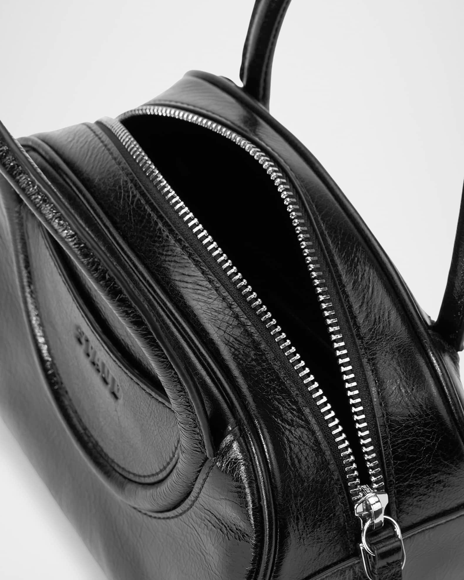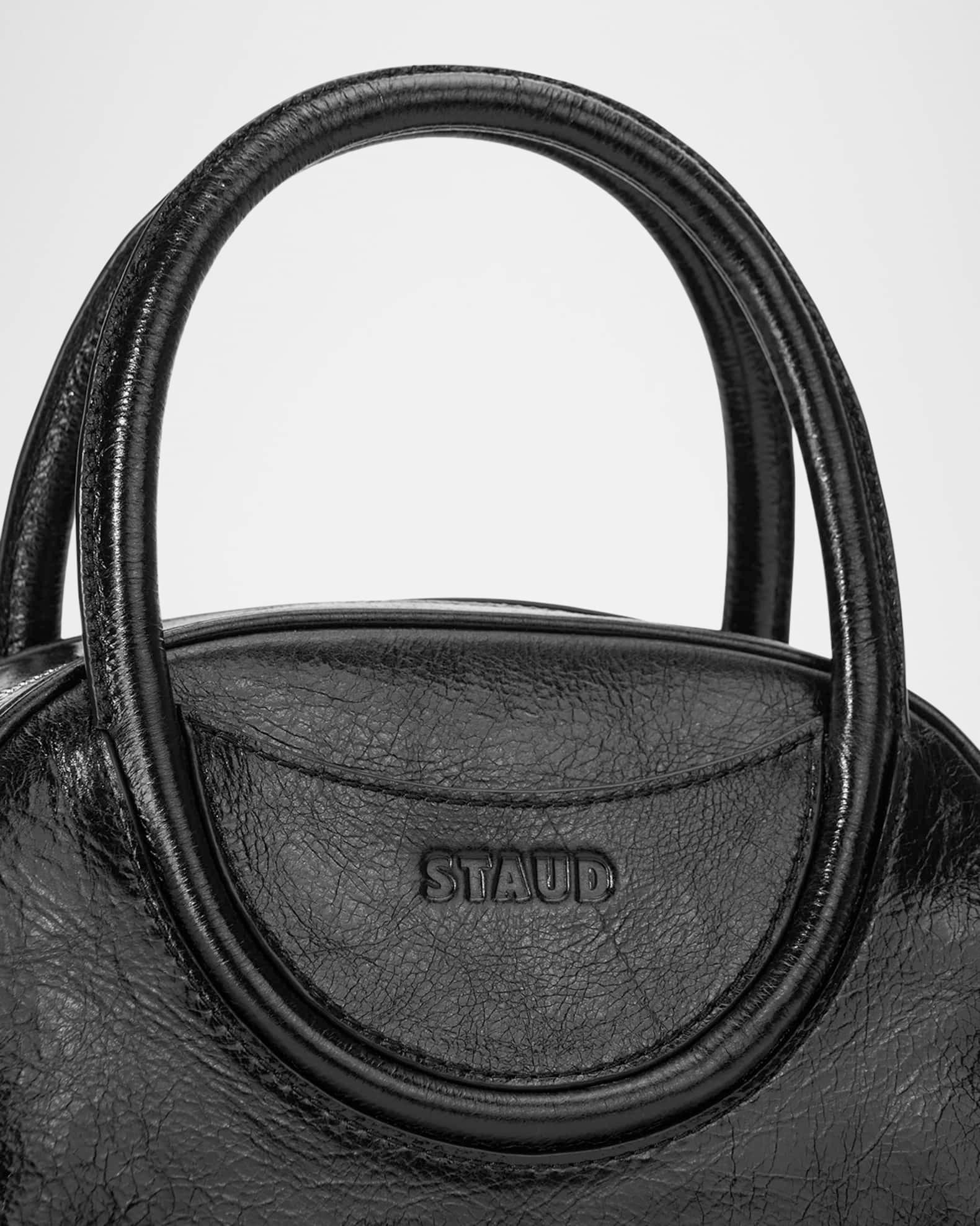 STAUD "Maude" bowler top handle bag in leather Ring top handles, 3.5"L Detachable, adjustable crossbody strap Can be worn as a top handle or crossbody bag Zip top closure Exterior, one slip pocket Interior, one slip pocket Approx. 6.5"H x 7.5"W x 4.5"D Spot clean Imported