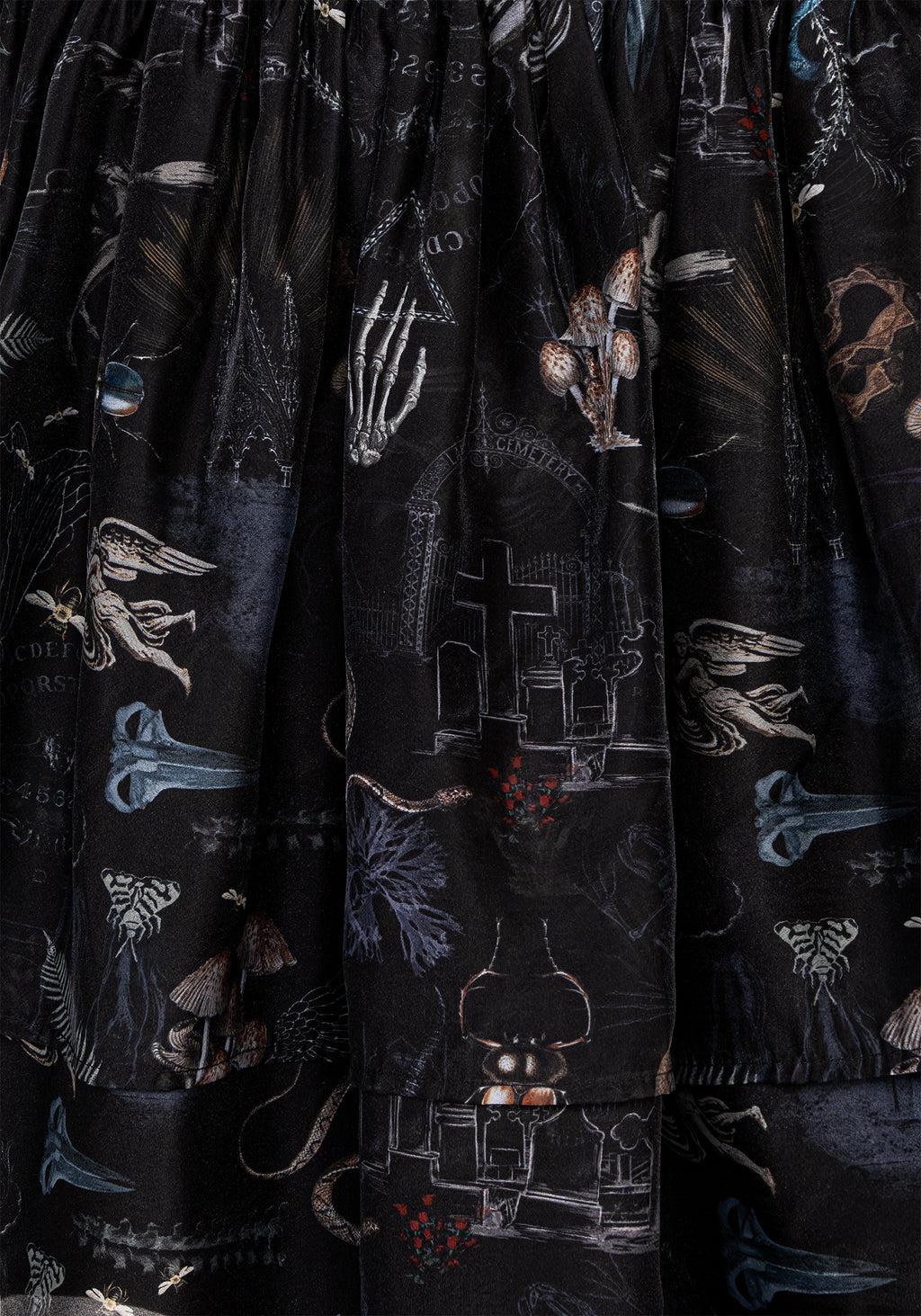 The air itself is filled with monsters- Black gothic Victoriana print layered organza mini dress - Flattering fit ‘n’ flare shape with layered mini-length skirt - High neckline with keyhole feature at front & short puff sleeves - Elasticated waistline for easy over-head dressing & comfortable all-day wear - Lightweight floaty sheer organza features a ghoulish Victorian-inspired skeleton print (all-over design) - Solid black lining for modesty - Victoriana-chic for the modern age Main: 100% polyesterLining: 93% polyester, 7% elastaneAnna is 5'7" and wearing a UK8/ US4