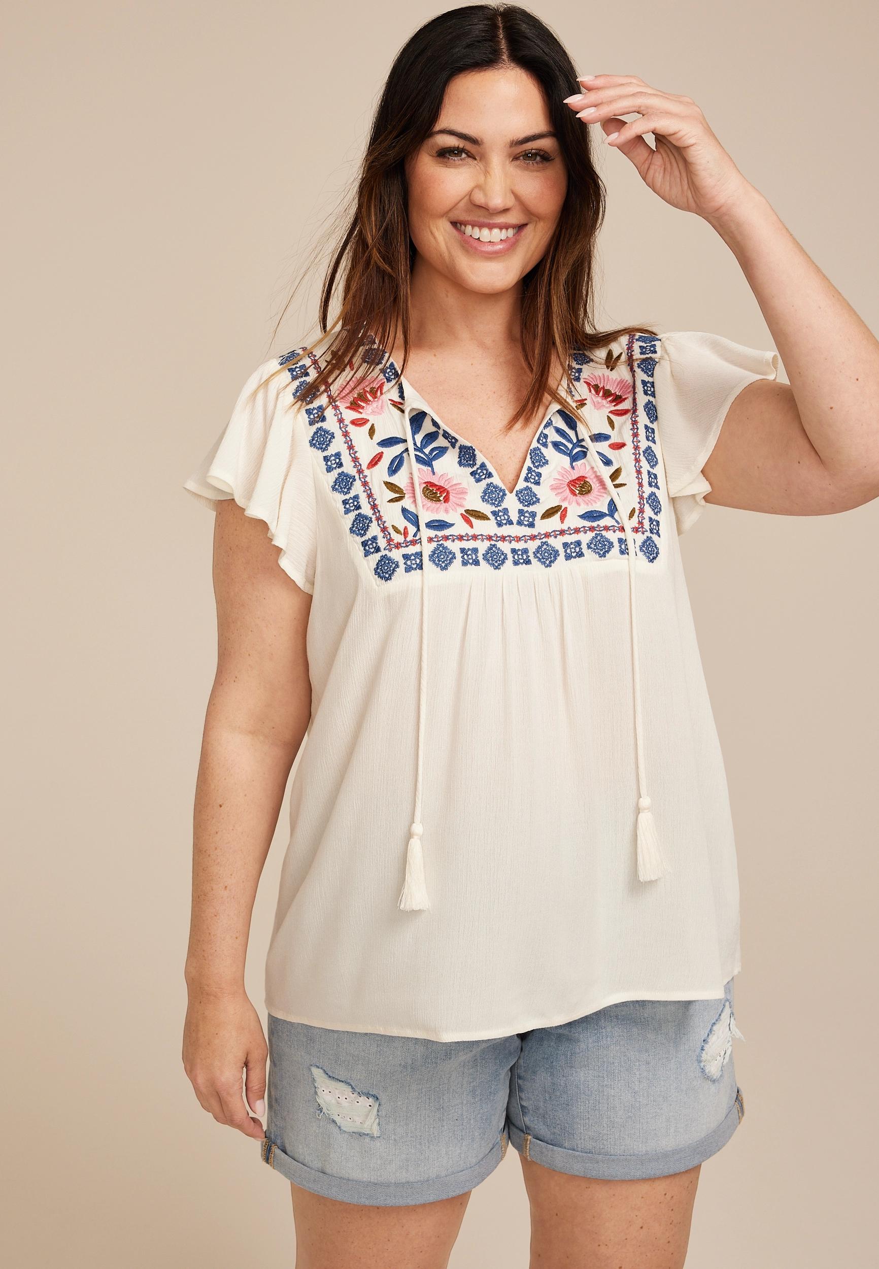 Maurices 2X Plus Size Womens Embroidered Tie Front Blouse