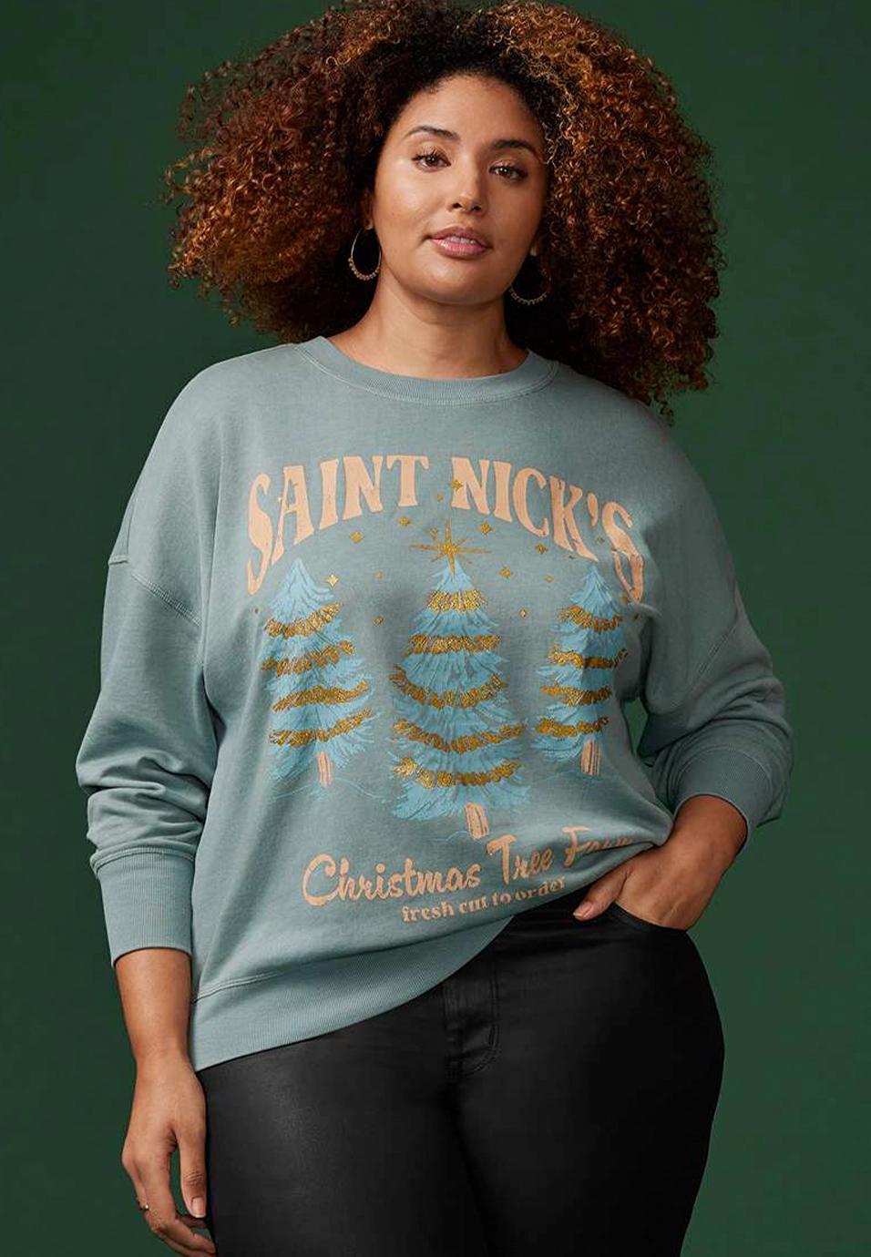 Maurices Plus Size Womens St Nicks Christmas Tree Farm Relaxed Fit Sweatshirt